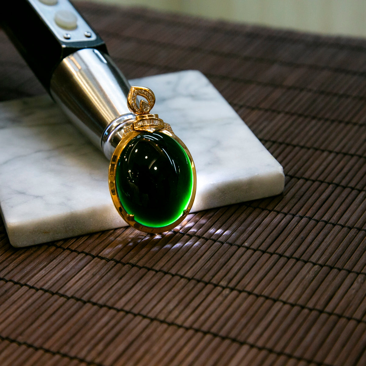 18K Gold Diamond Natural Burmese Jade Ink Jade Big Cabochon Pendant