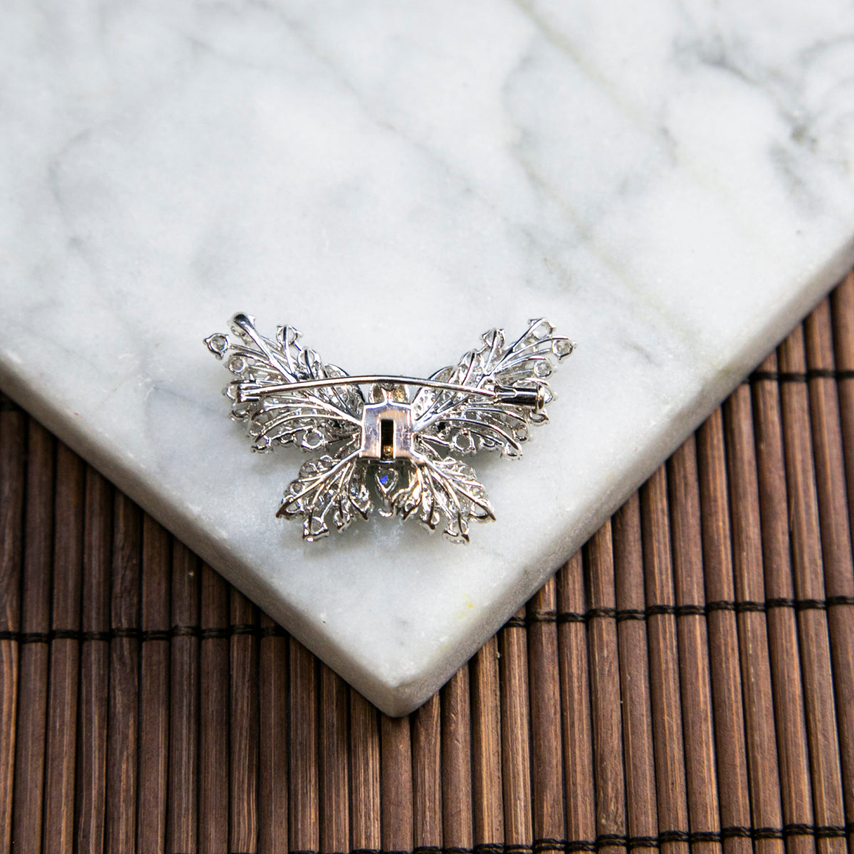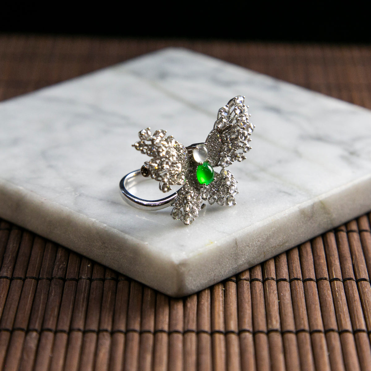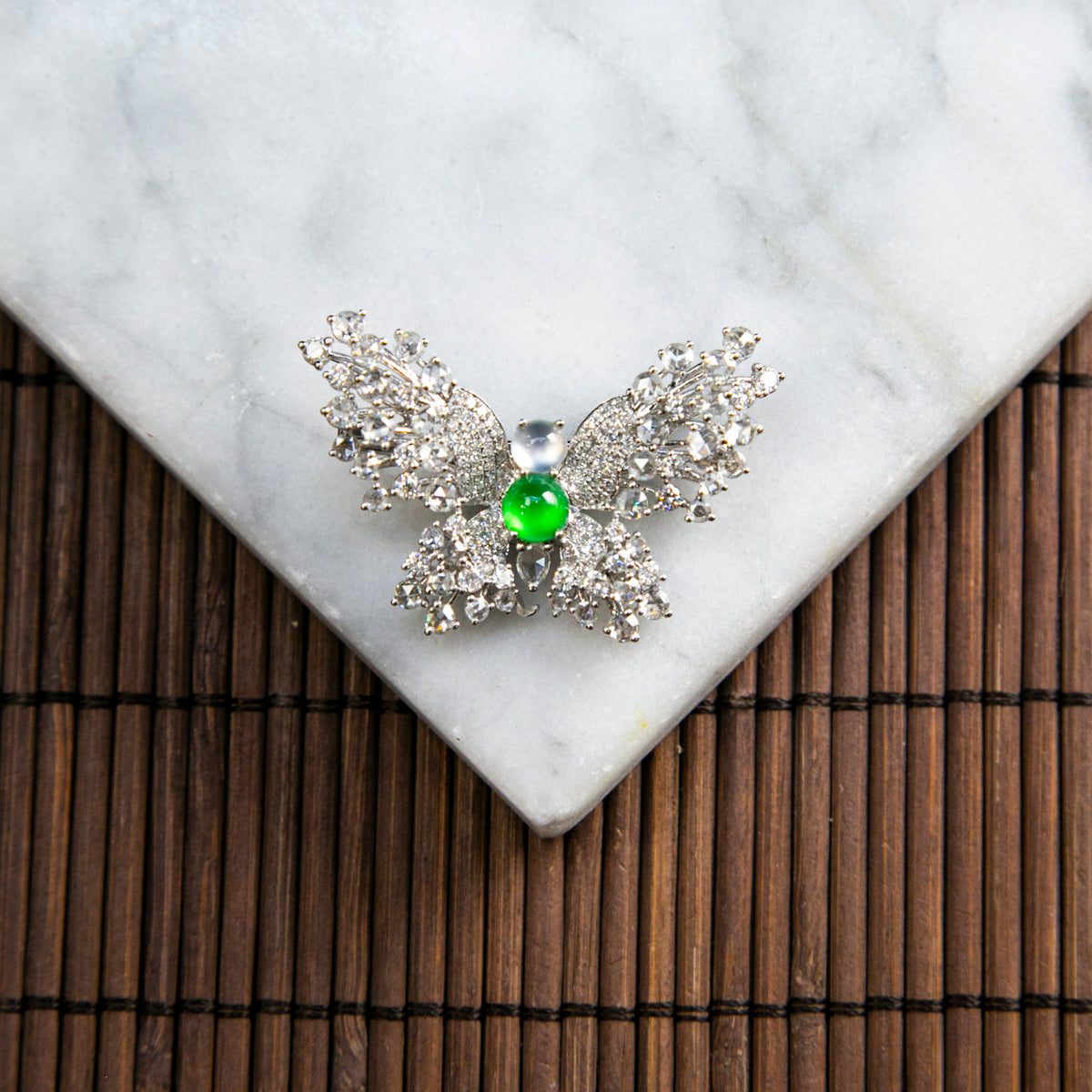 18K Platinum Diamond Natural Burmese Jade Icy Green and White Cabochon Butterfly Design Pin & Ring