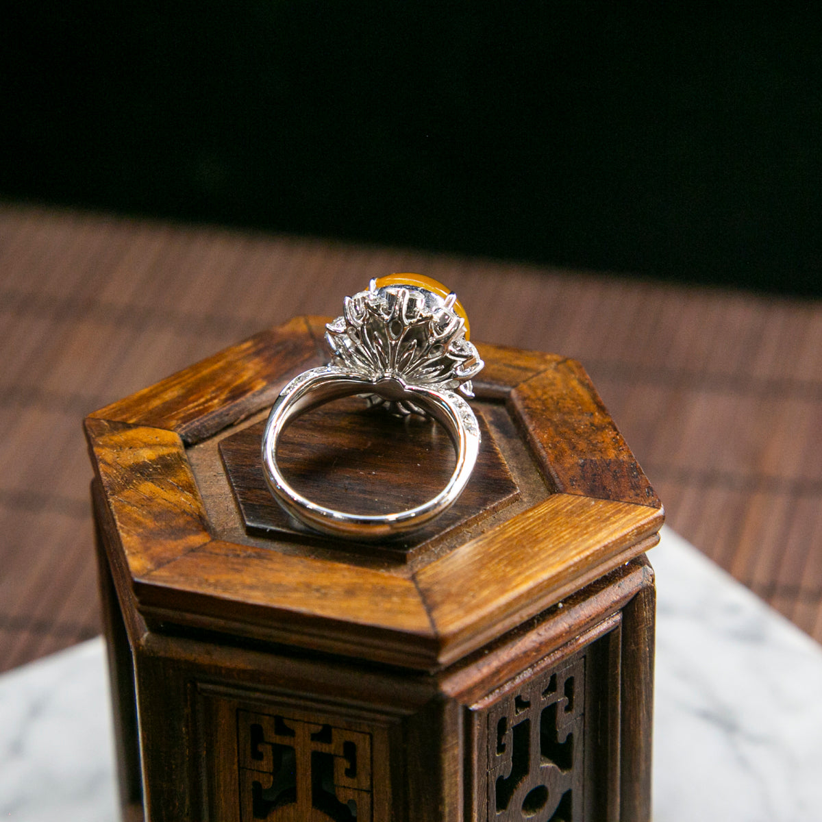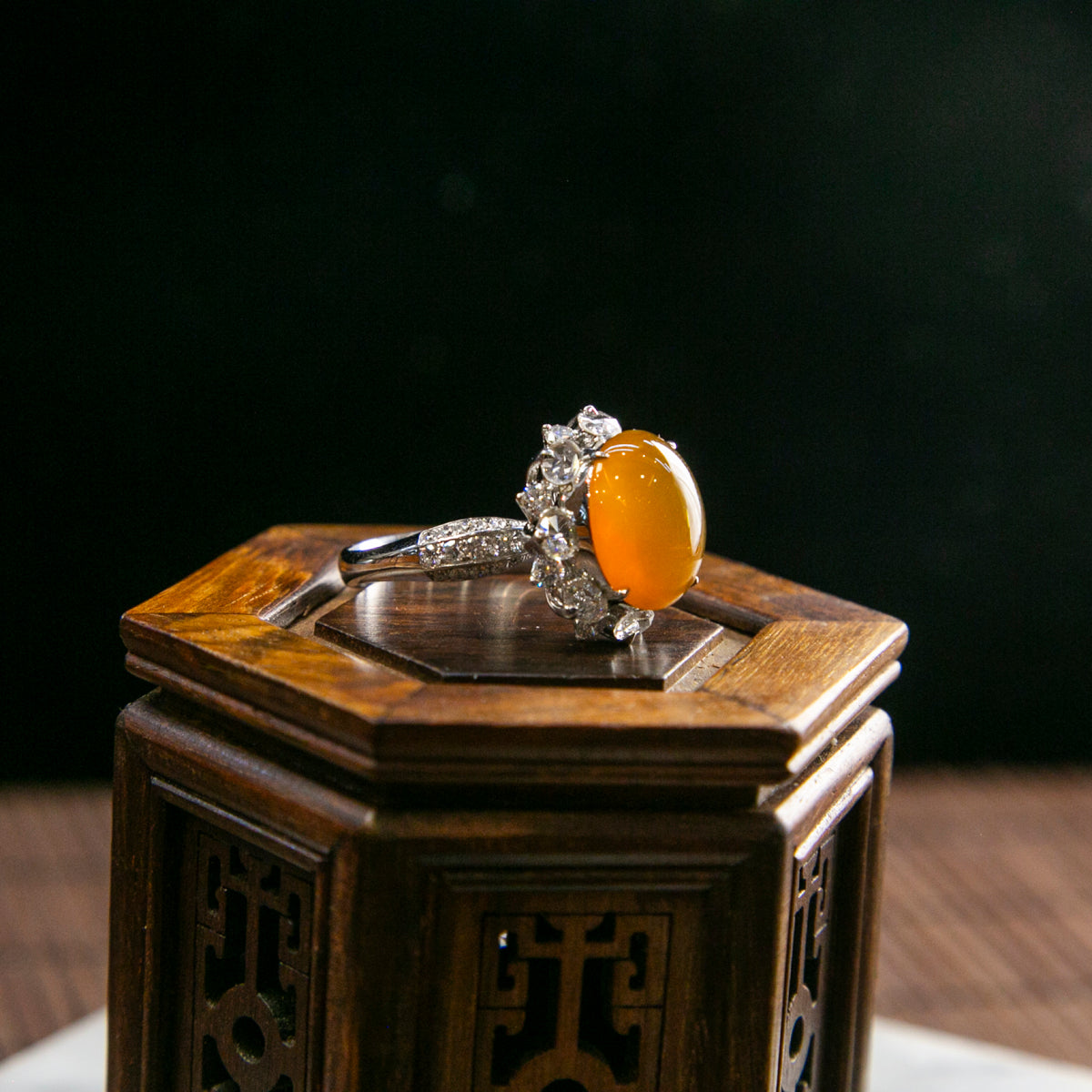 18K Platinum Diamond Natural Burmese Jade Orange Cabochon Ring