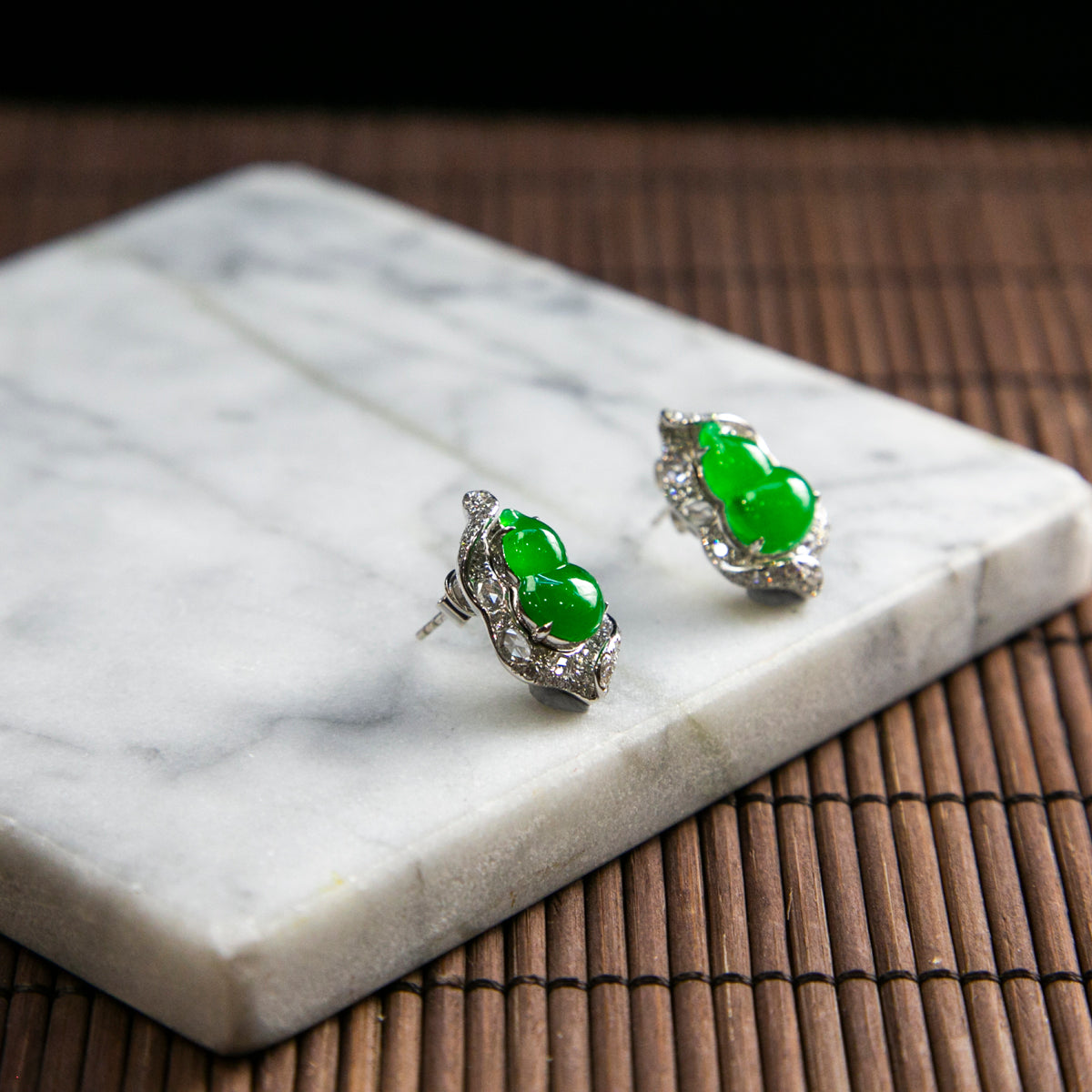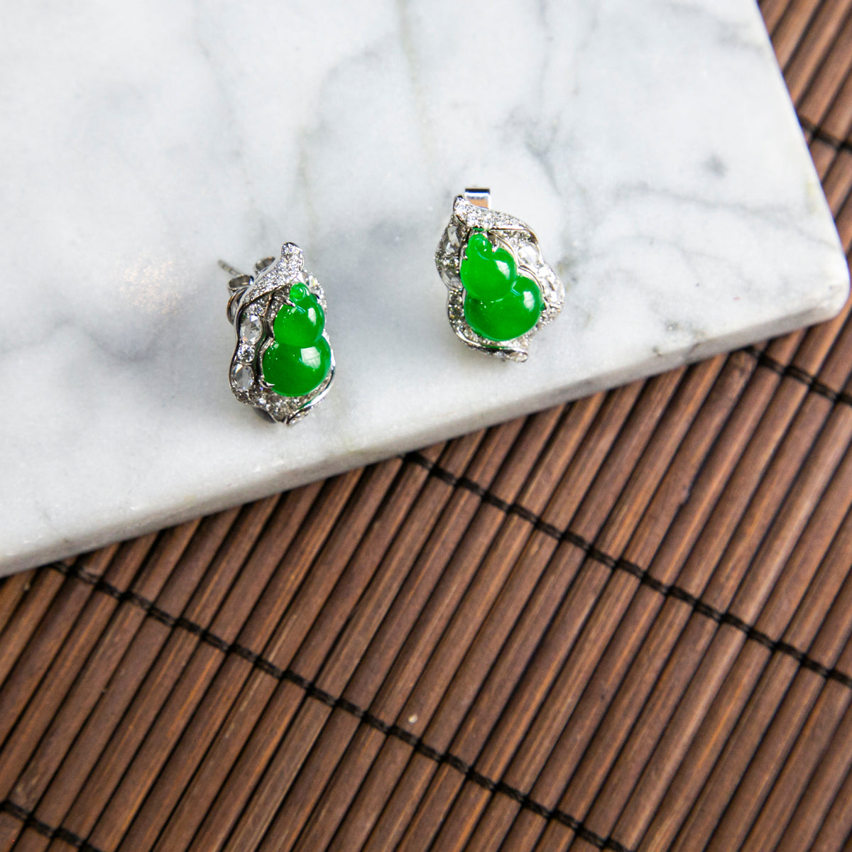 18K Platinum Diamond Natural Burmese Jade Imperial Green Gourd Ear Studs