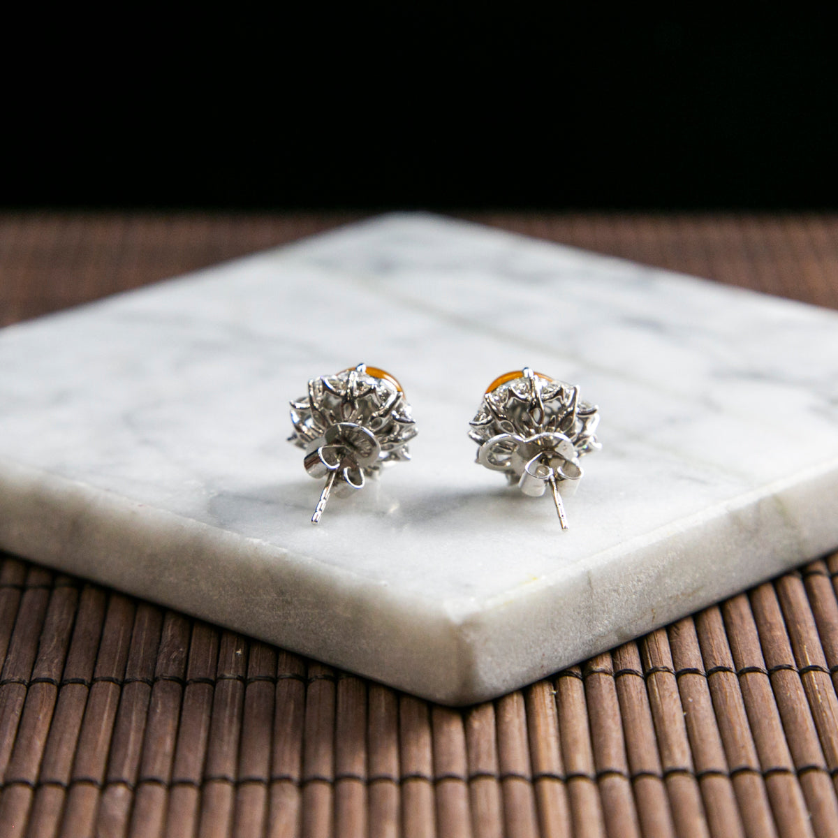 18K Platinum Diamond Natural Burmese Jade Icy Orange Cabochon Ear Studs