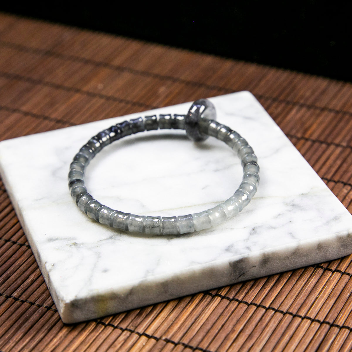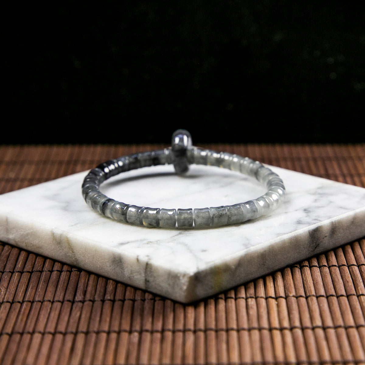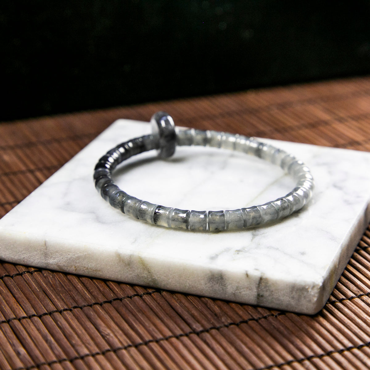 Natural Burmese Jade Gradient Wuji Black Barrel Beads Bracelet with Jade Donut