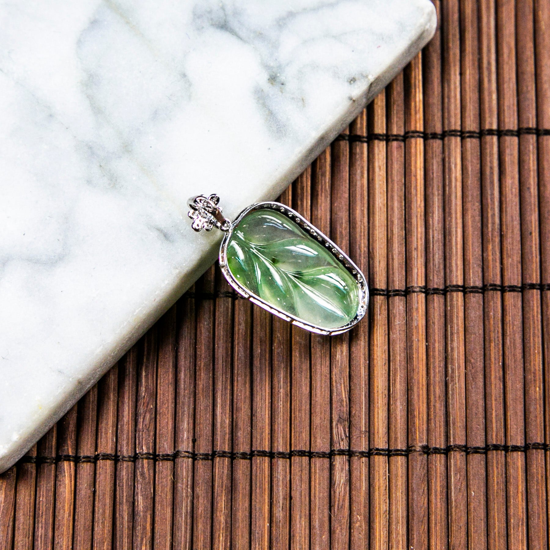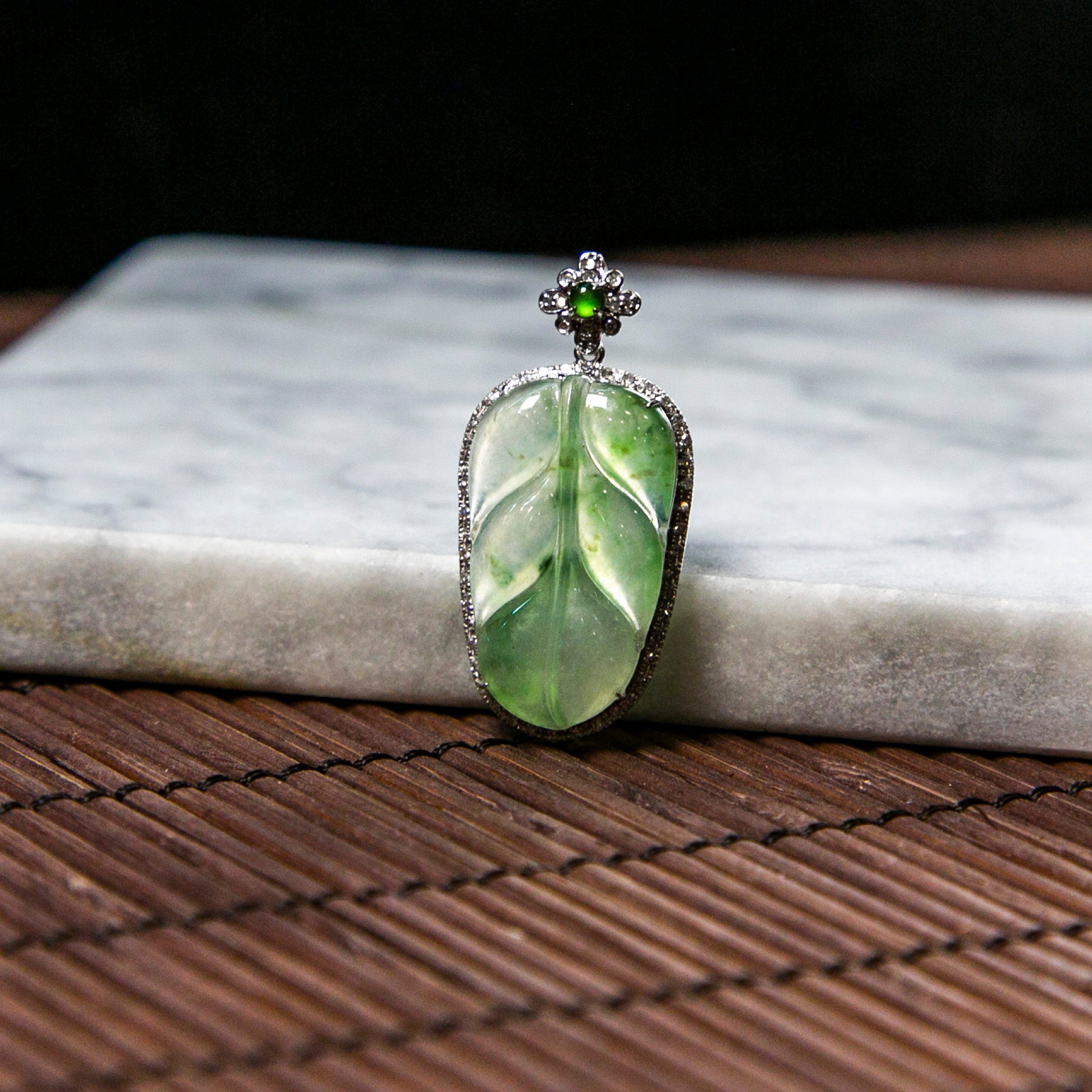 18K Platinum Diamond Natural Burmese Jade Icy Light Green Piao Hua Leaf Pendant
