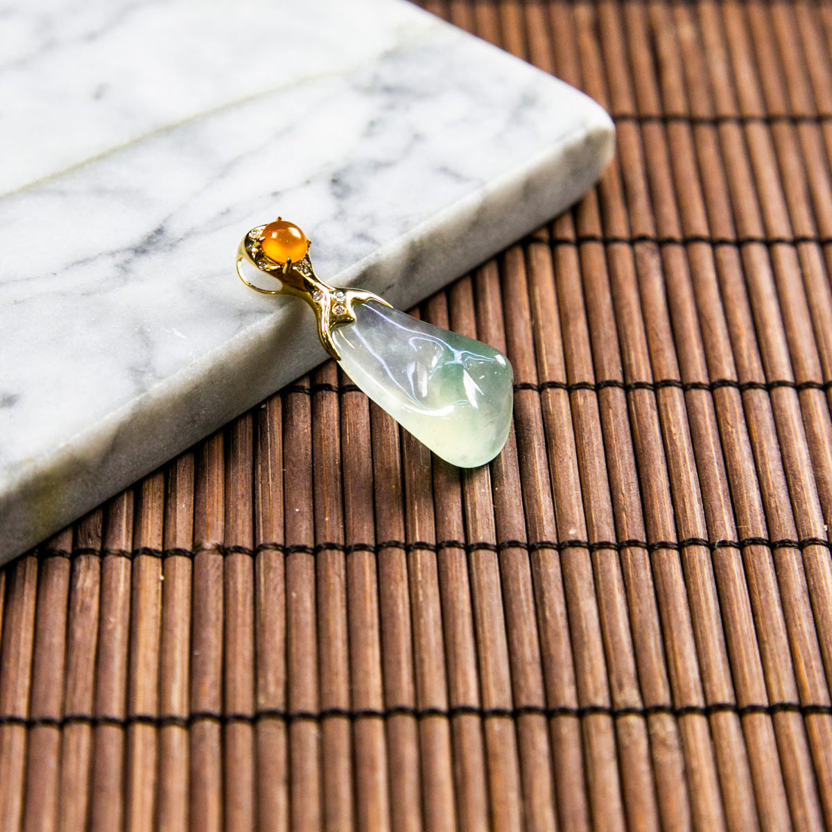 18K Gold Diamond Natural Burmese Jade Icy Piao Hua Pendant with Orange Cabochon