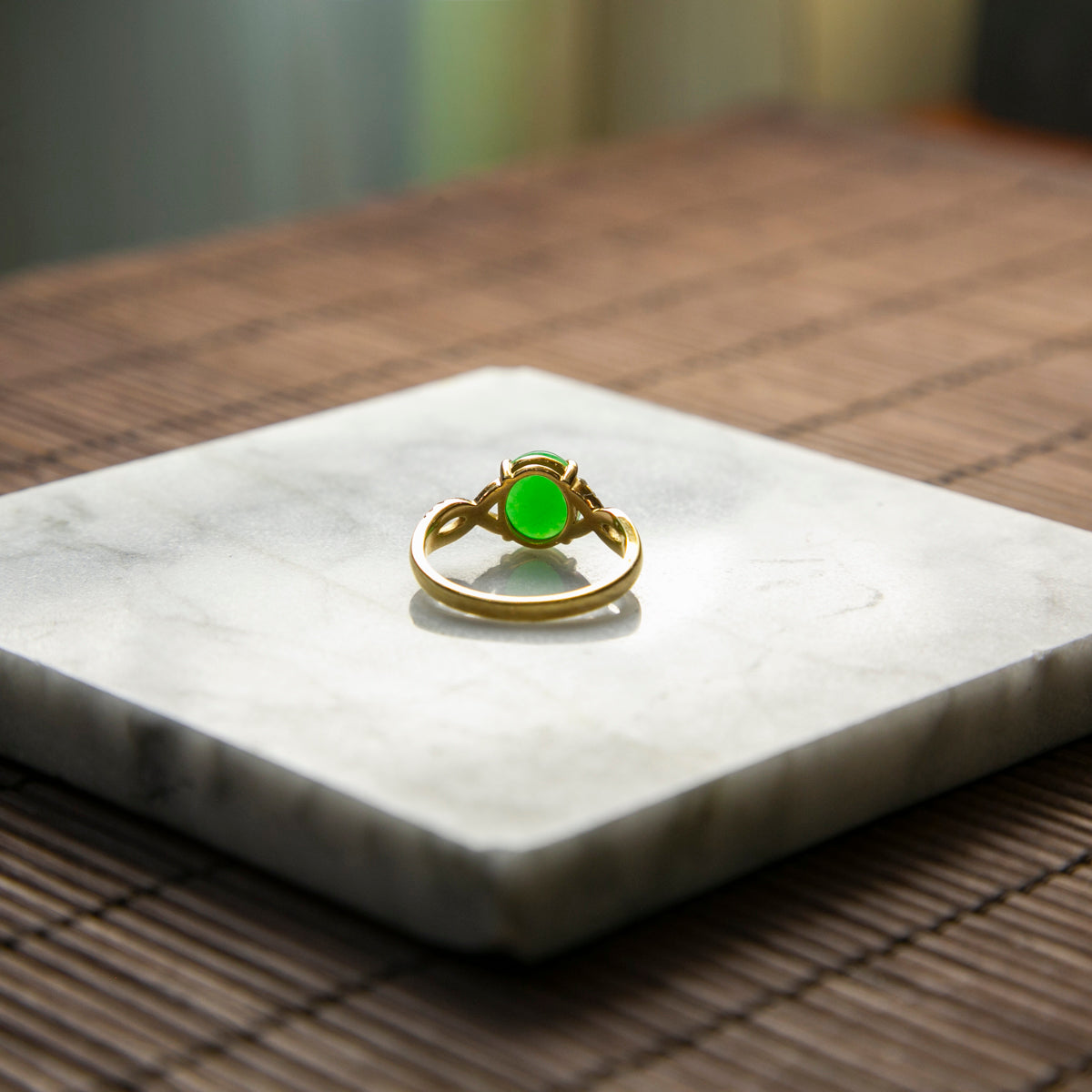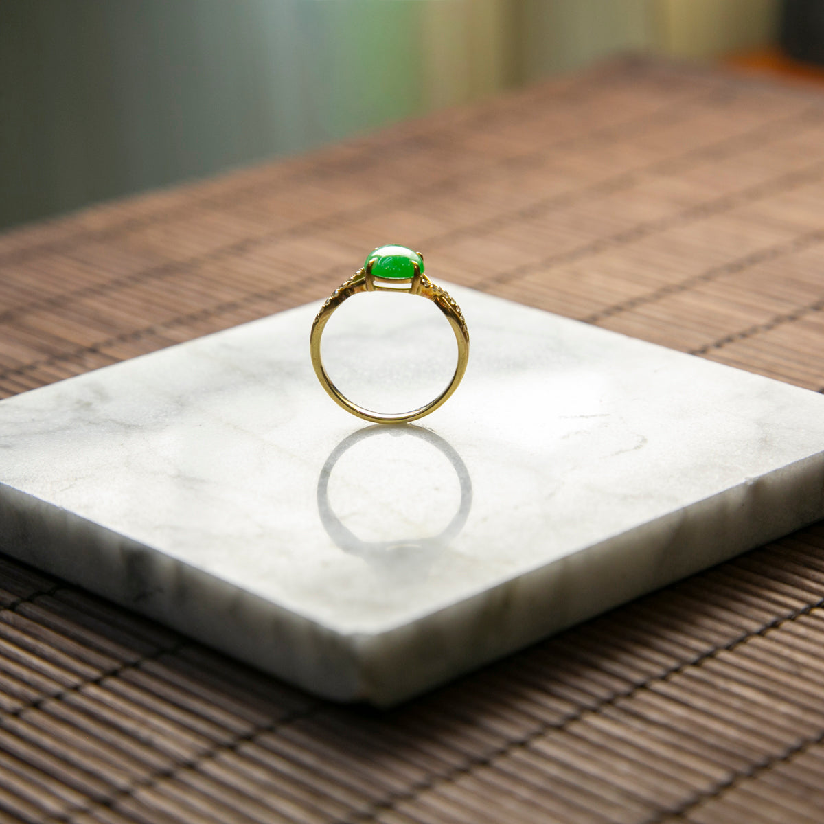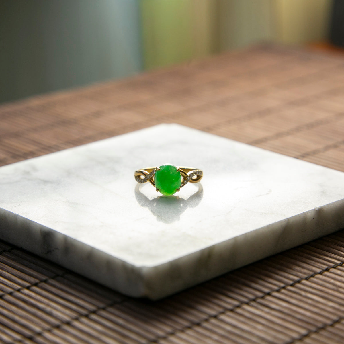 18K Gold Diamond Natural Burmese Bright Green Cabochon Ring