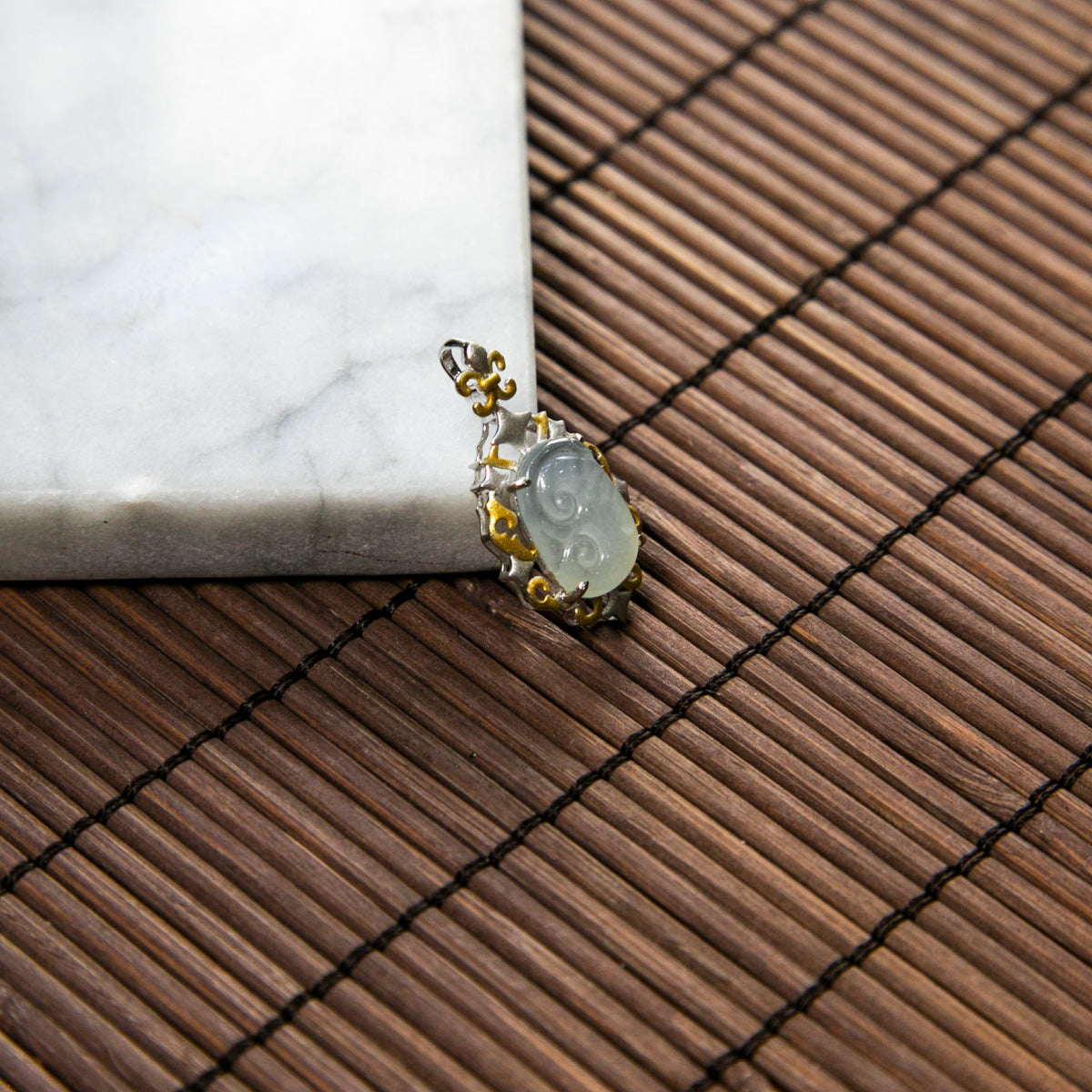 18K Gold Natural Burmese Jade Icy White Ruyi Pendant