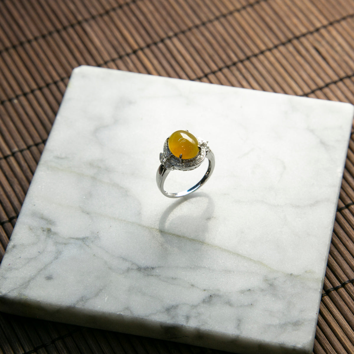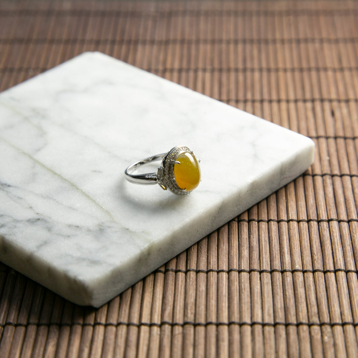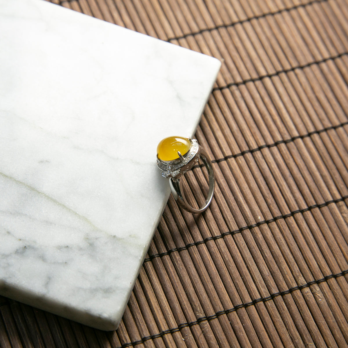18K Platinum Diamond Natural Burmese Yellow Jade Cabochon Ring