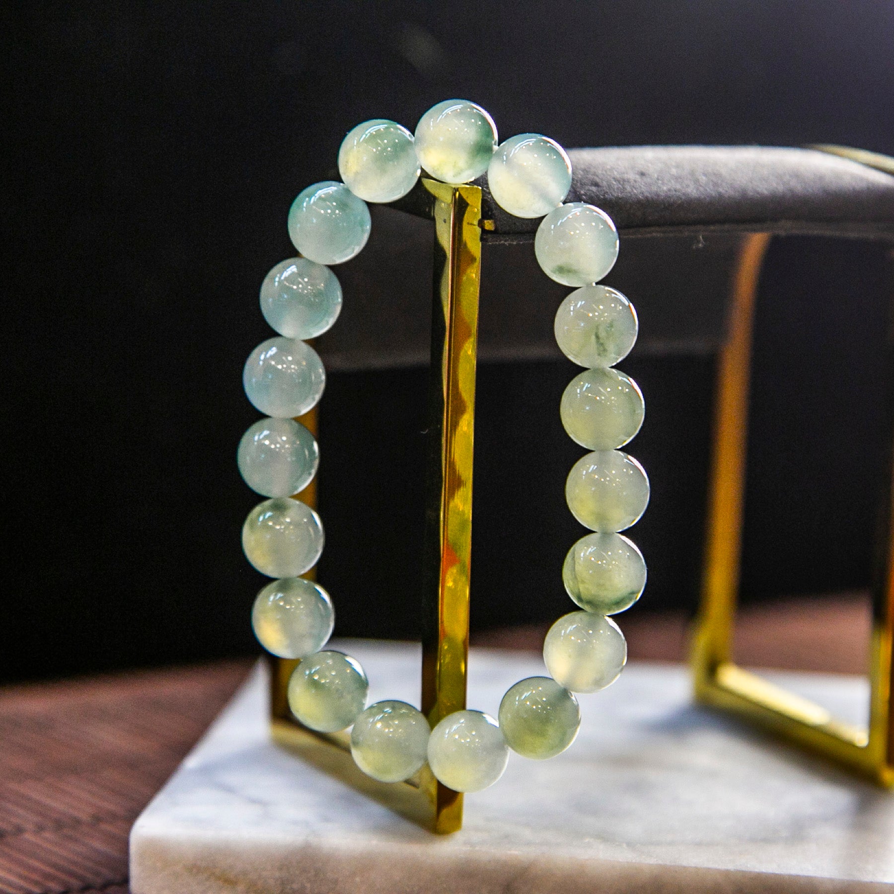 天然緬甸翡翠冰淡綠底飄花手珠串
