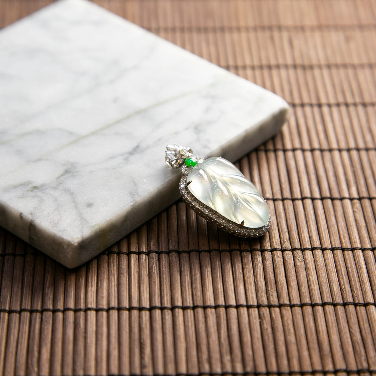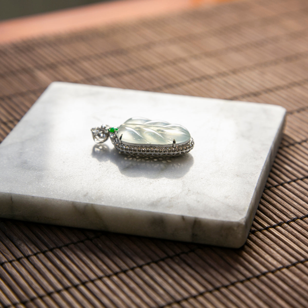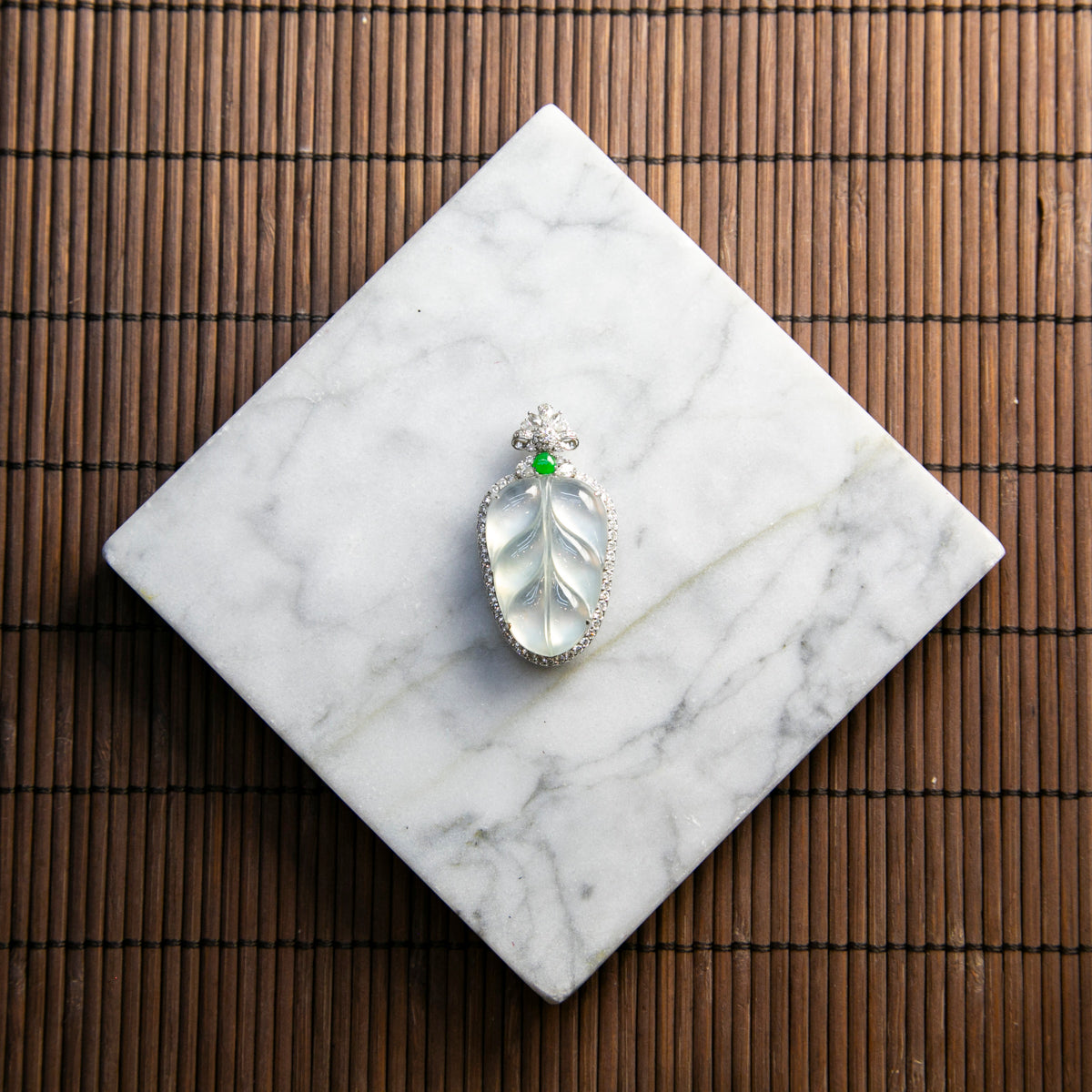 18K白金鑲鑽天然緬甸翡翠玻璃種冰白葉片吊墜