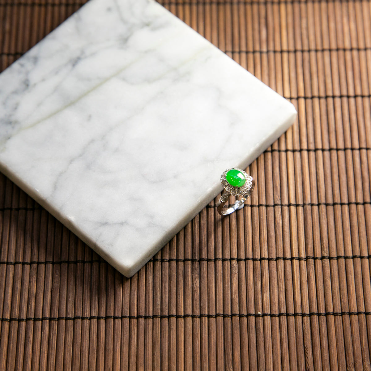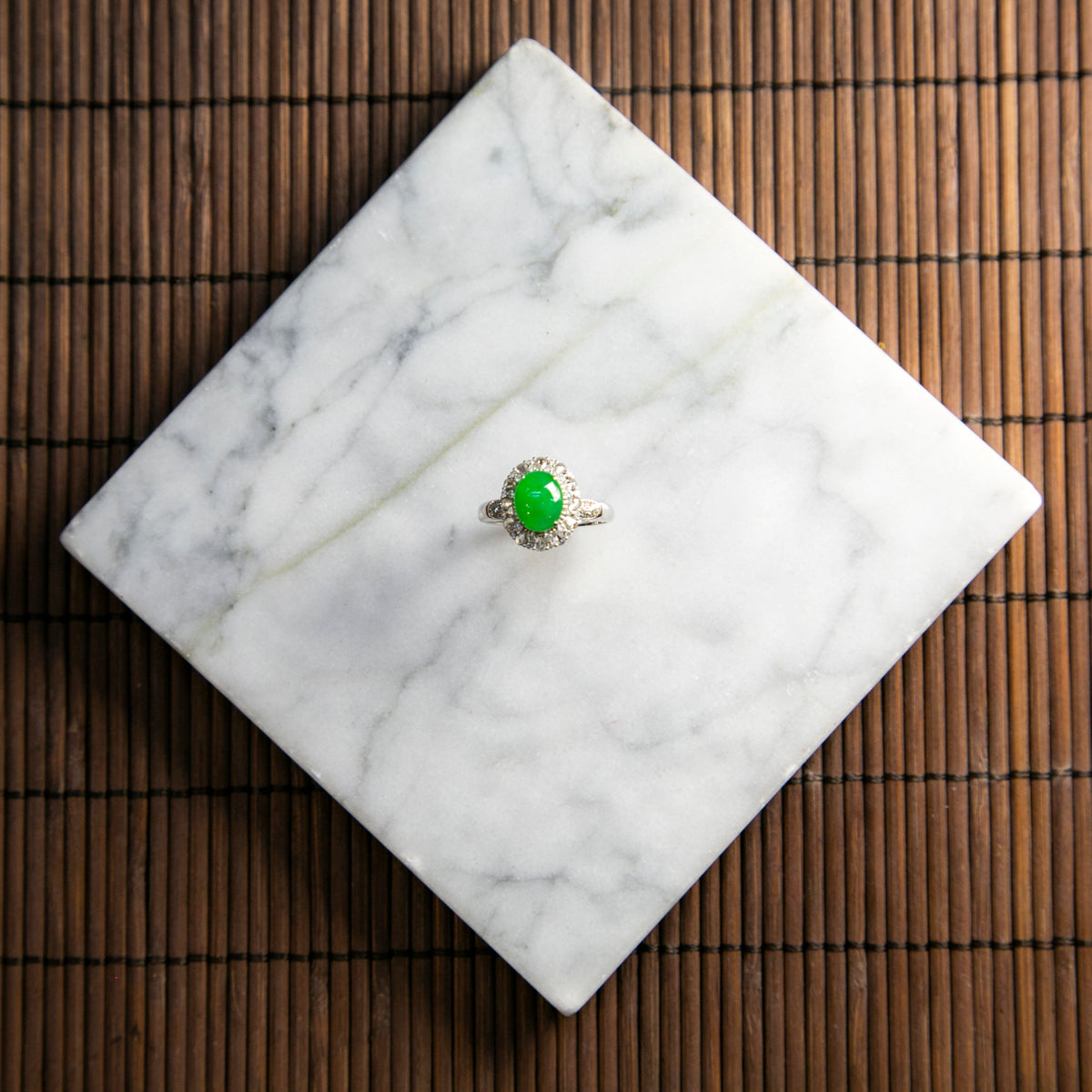 18K白金鑲鑽天然緬甸翡翠冰綠蛋面戒指