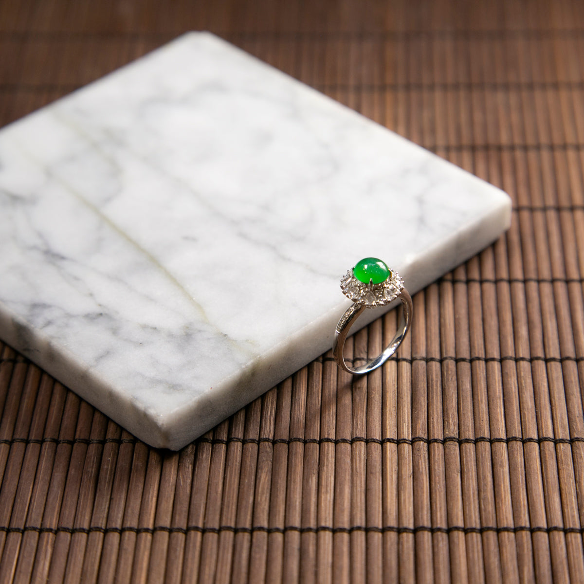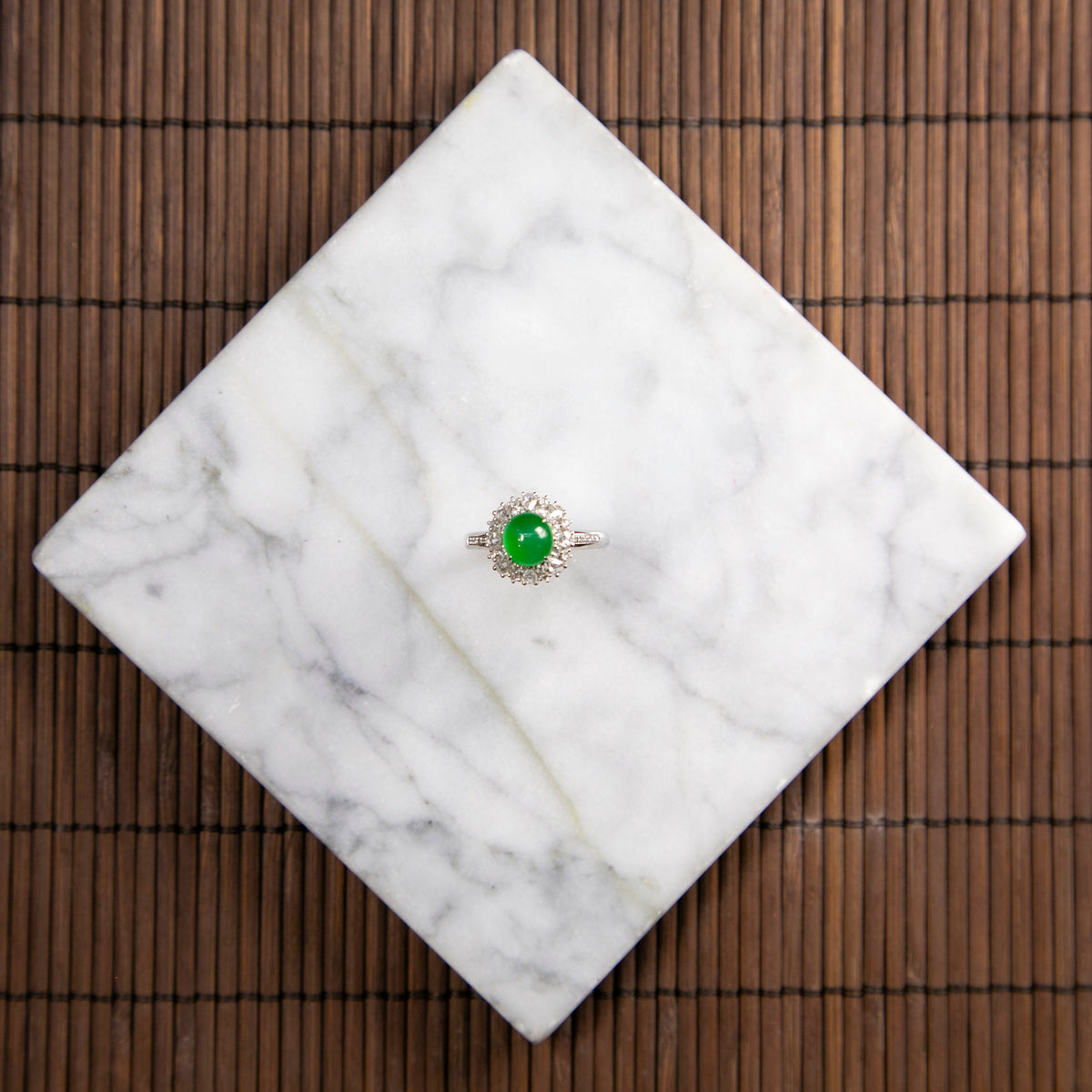18K白金鑲鑽天然緬甸翡翠冰陽綠蛋面戒指
