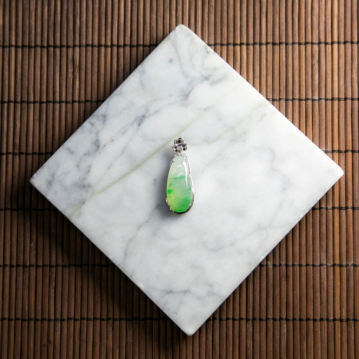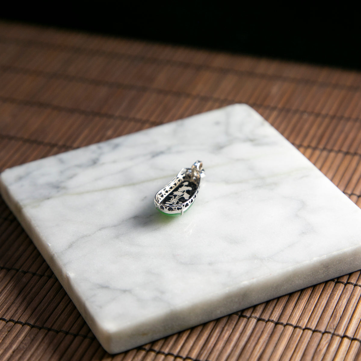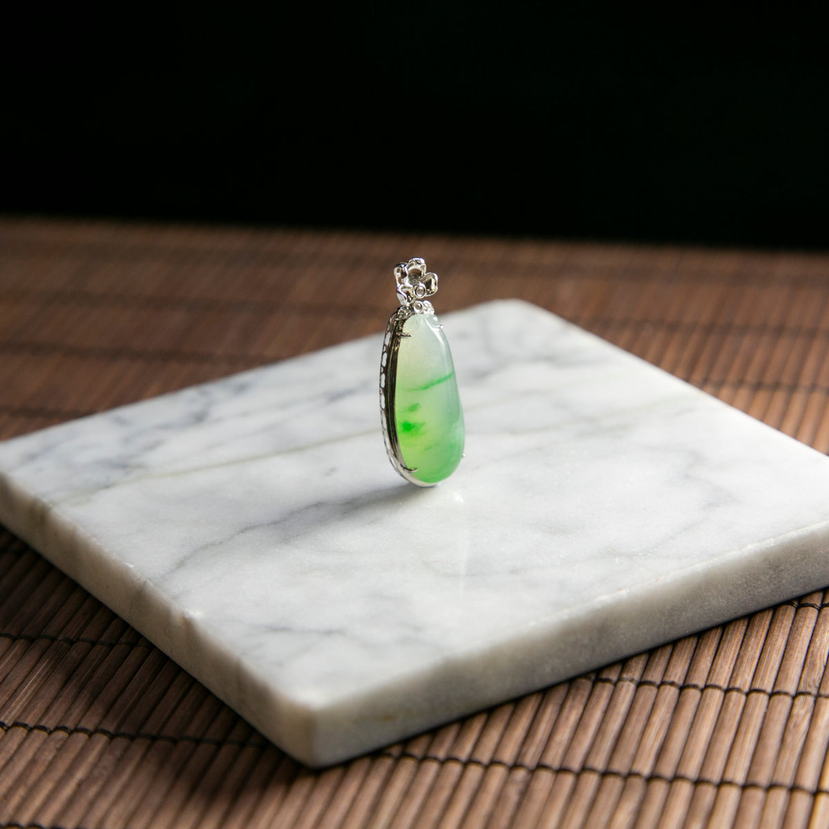 18K白金鑲鑽天然緬甸翡翠飄綠色根福瓜吊墜