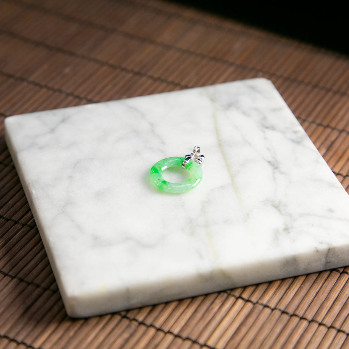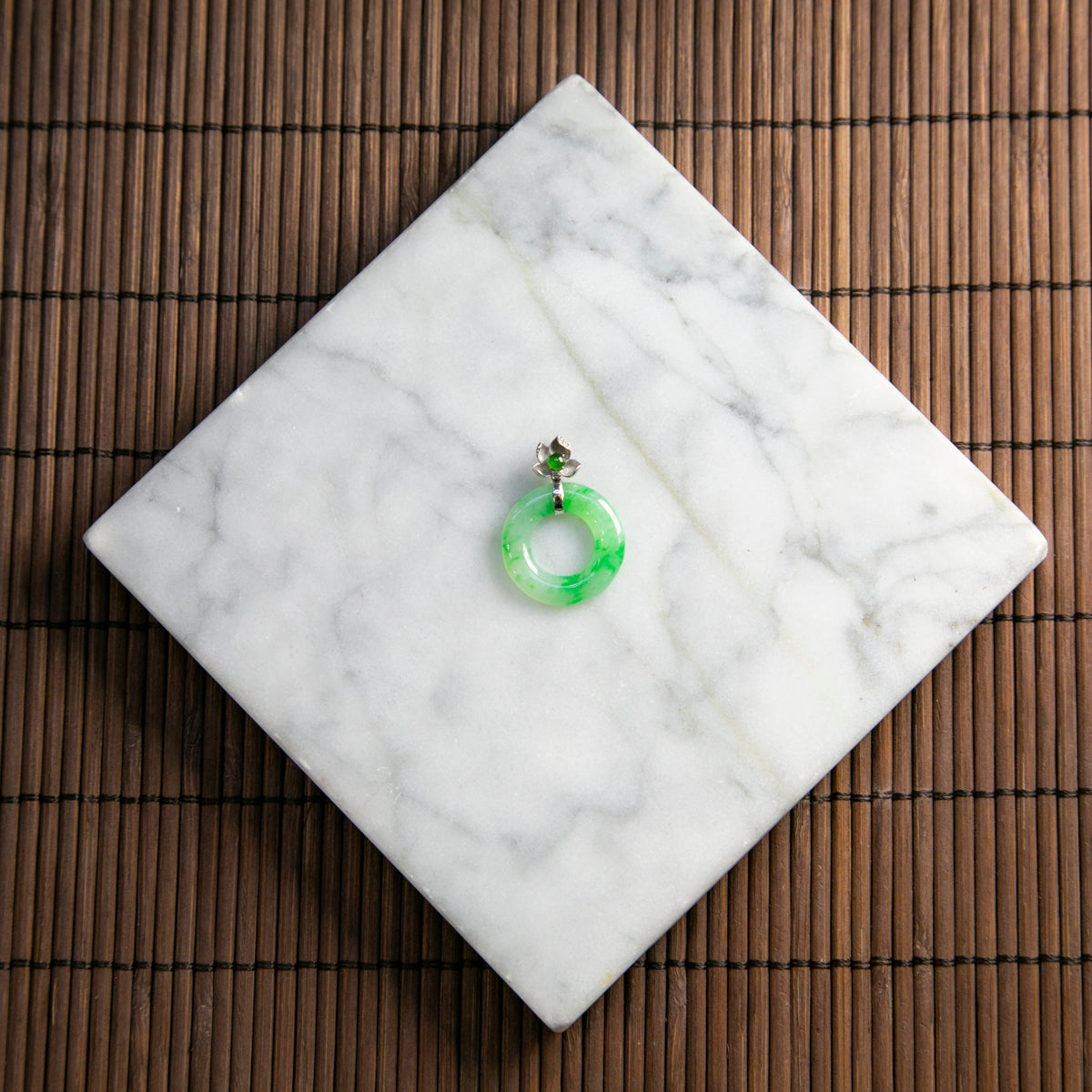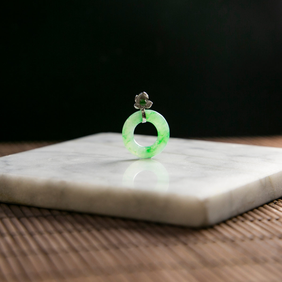 18K白金鑲鑽天然緬甸翡翠飄綠色根水泡吊墜
