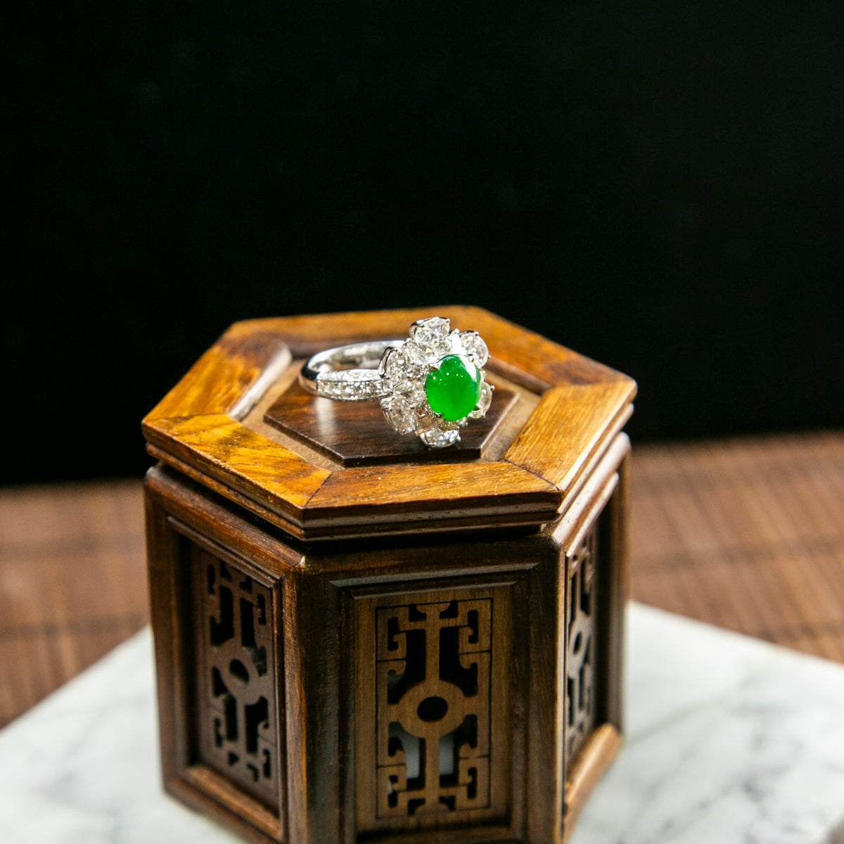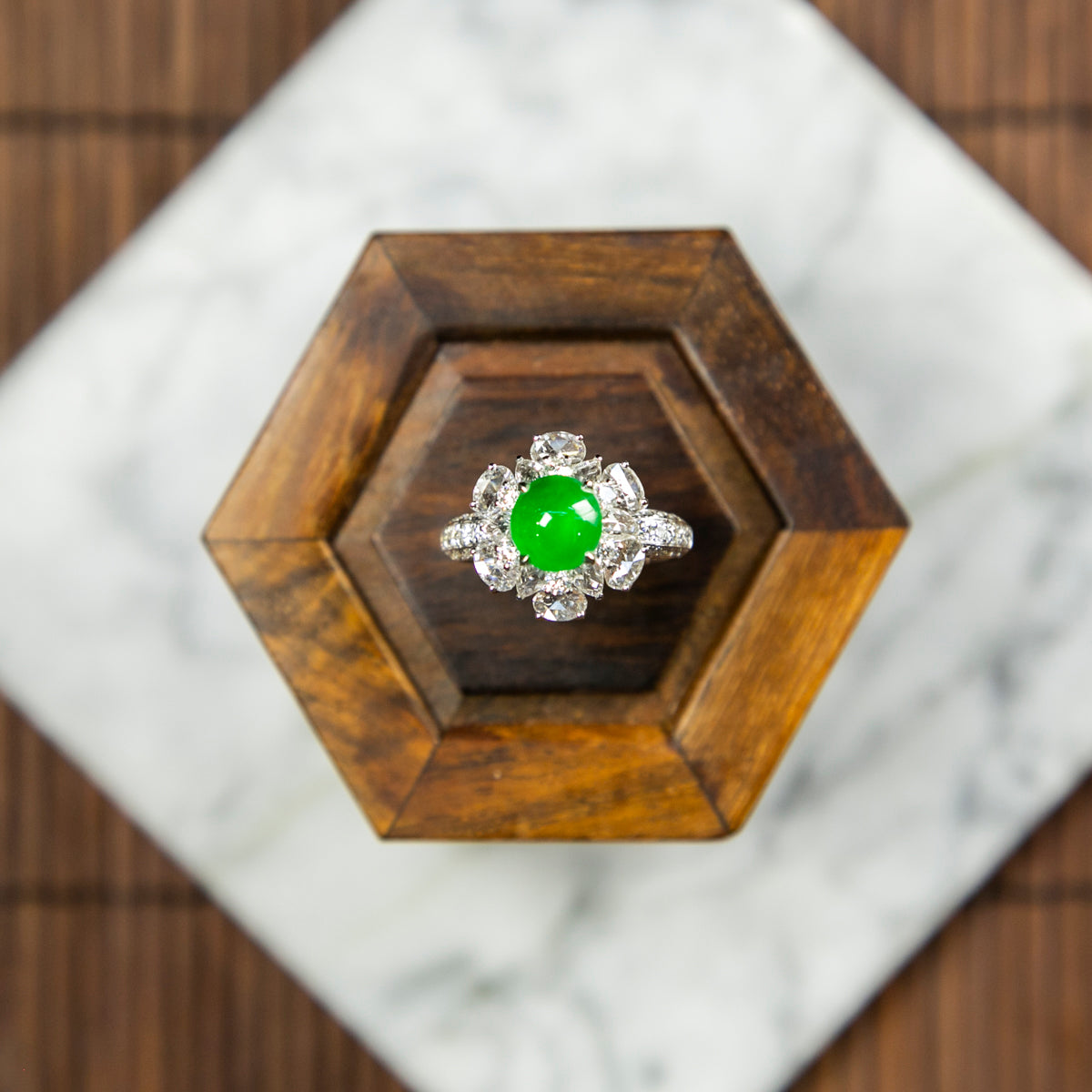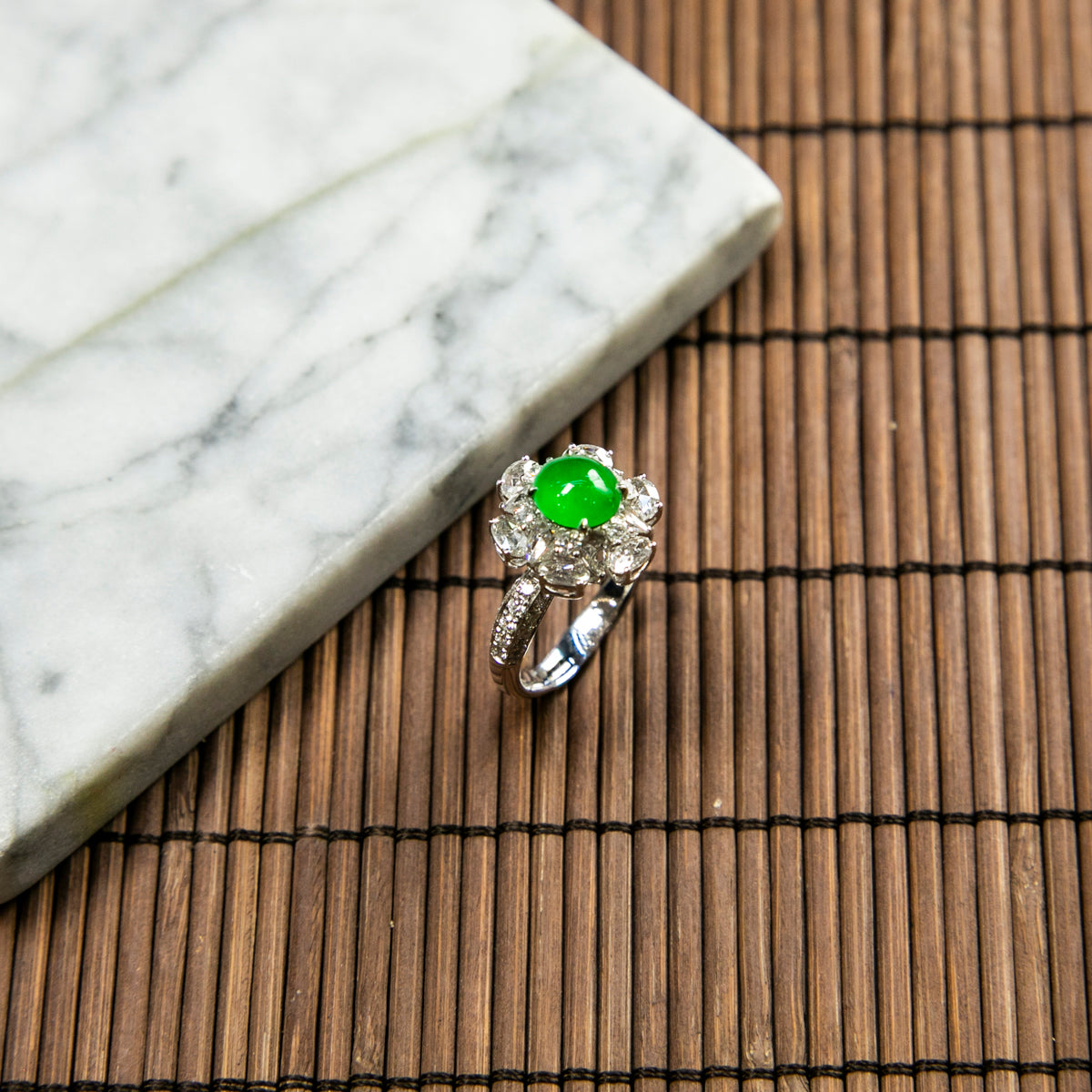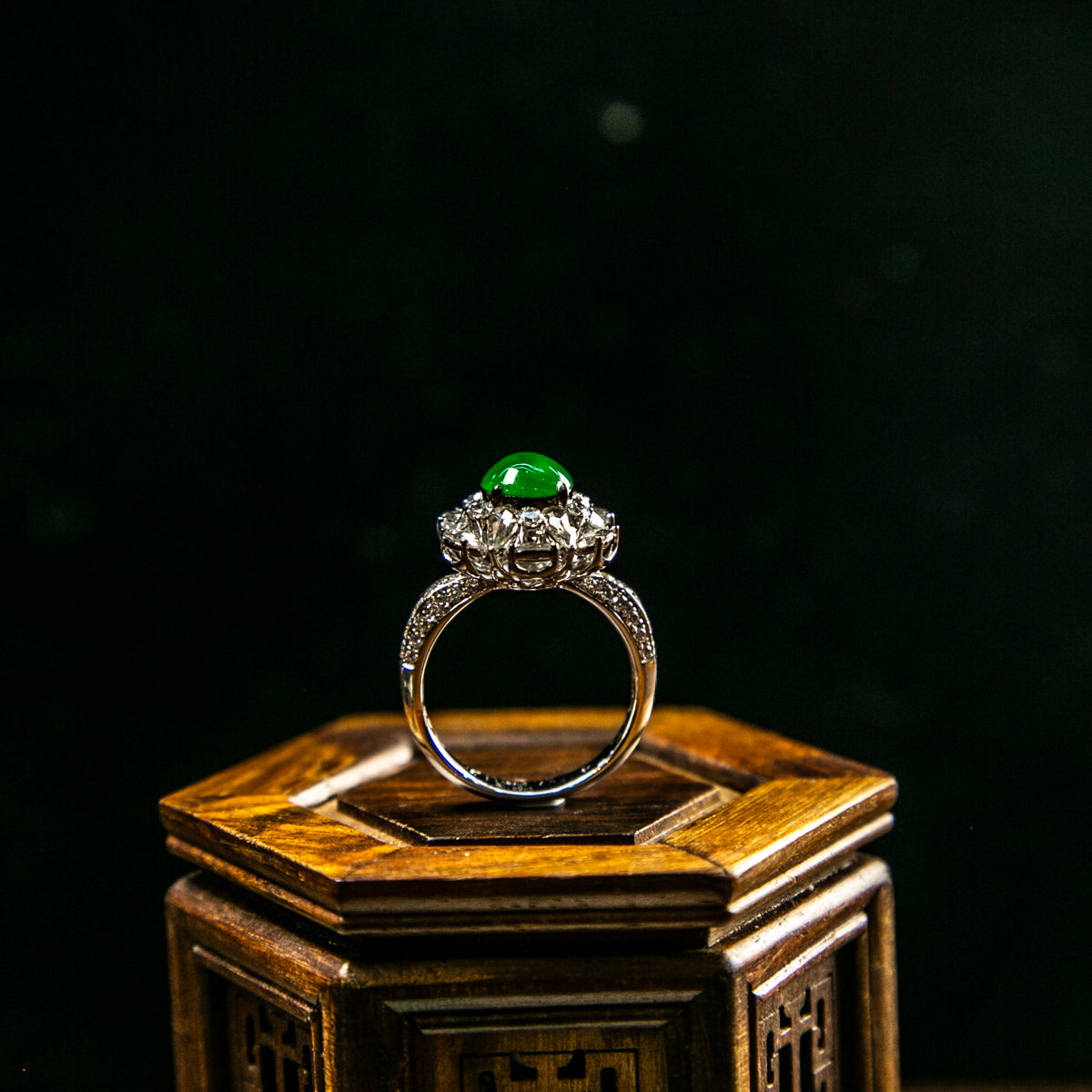 18K白金鑲鑽天然緬甸翡翠玻璃帝王綠蛋面戒指