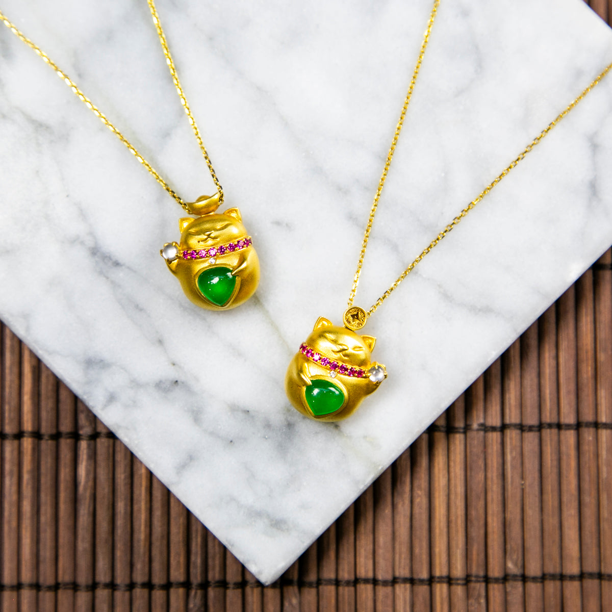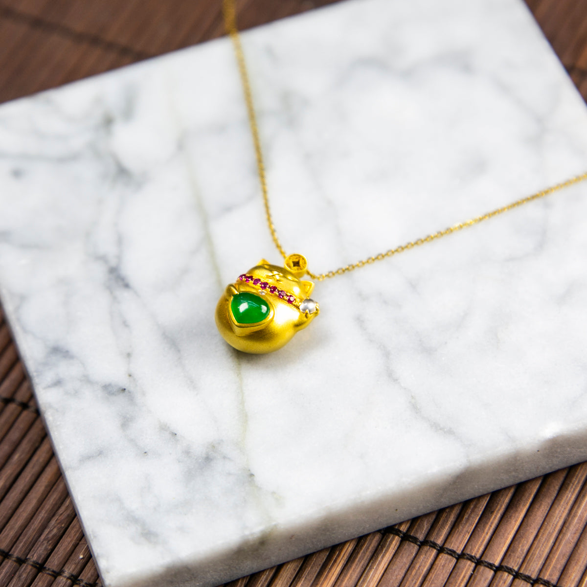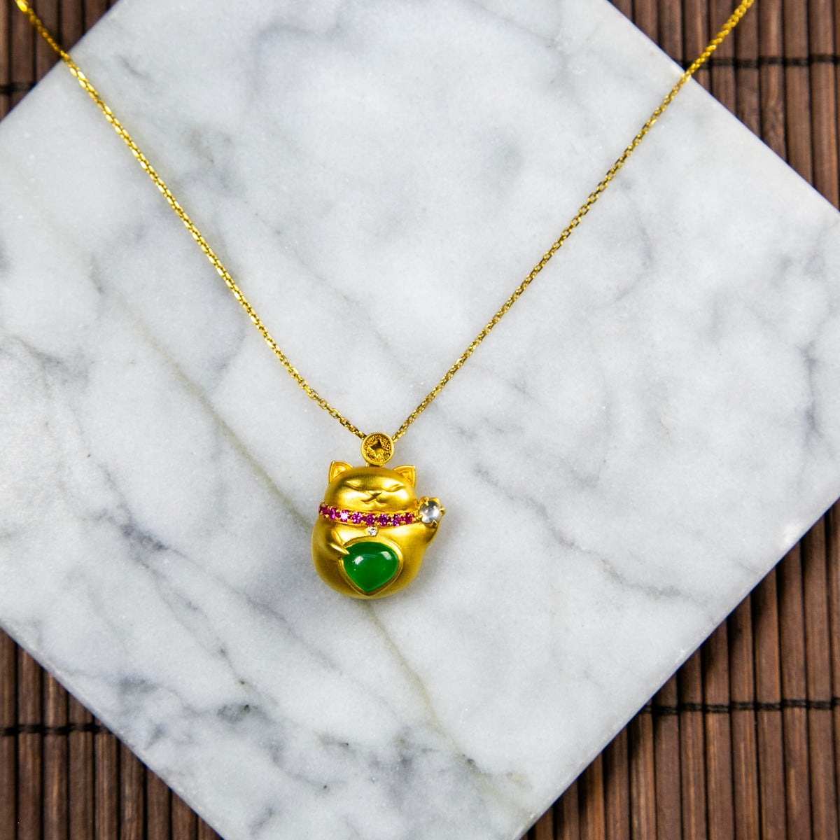 18K金鑲鑽天然緬甸翡翠玻璃帝王綠招財貓頸鏈