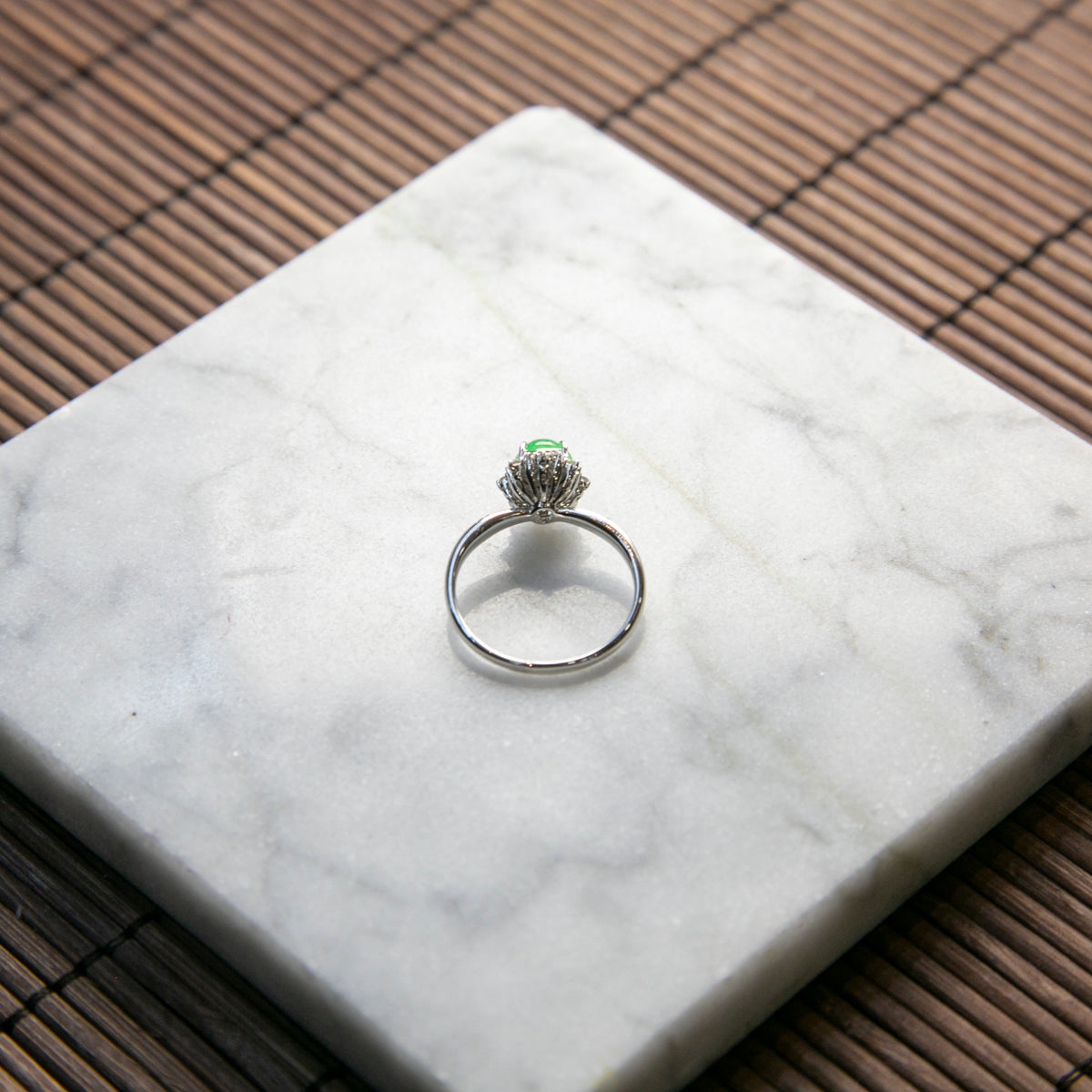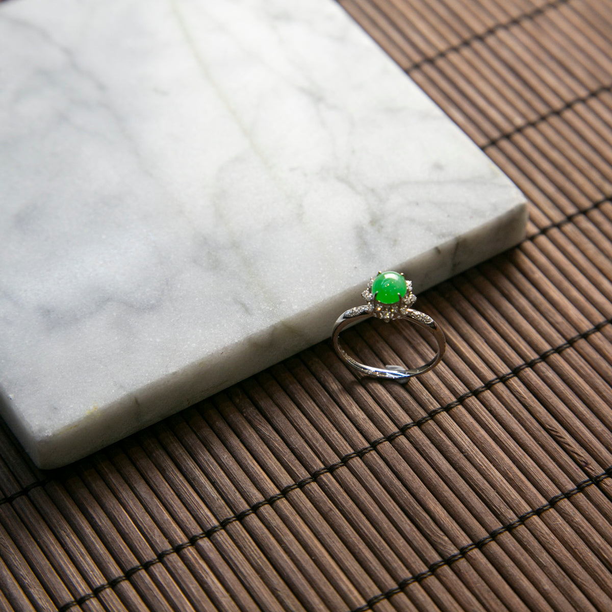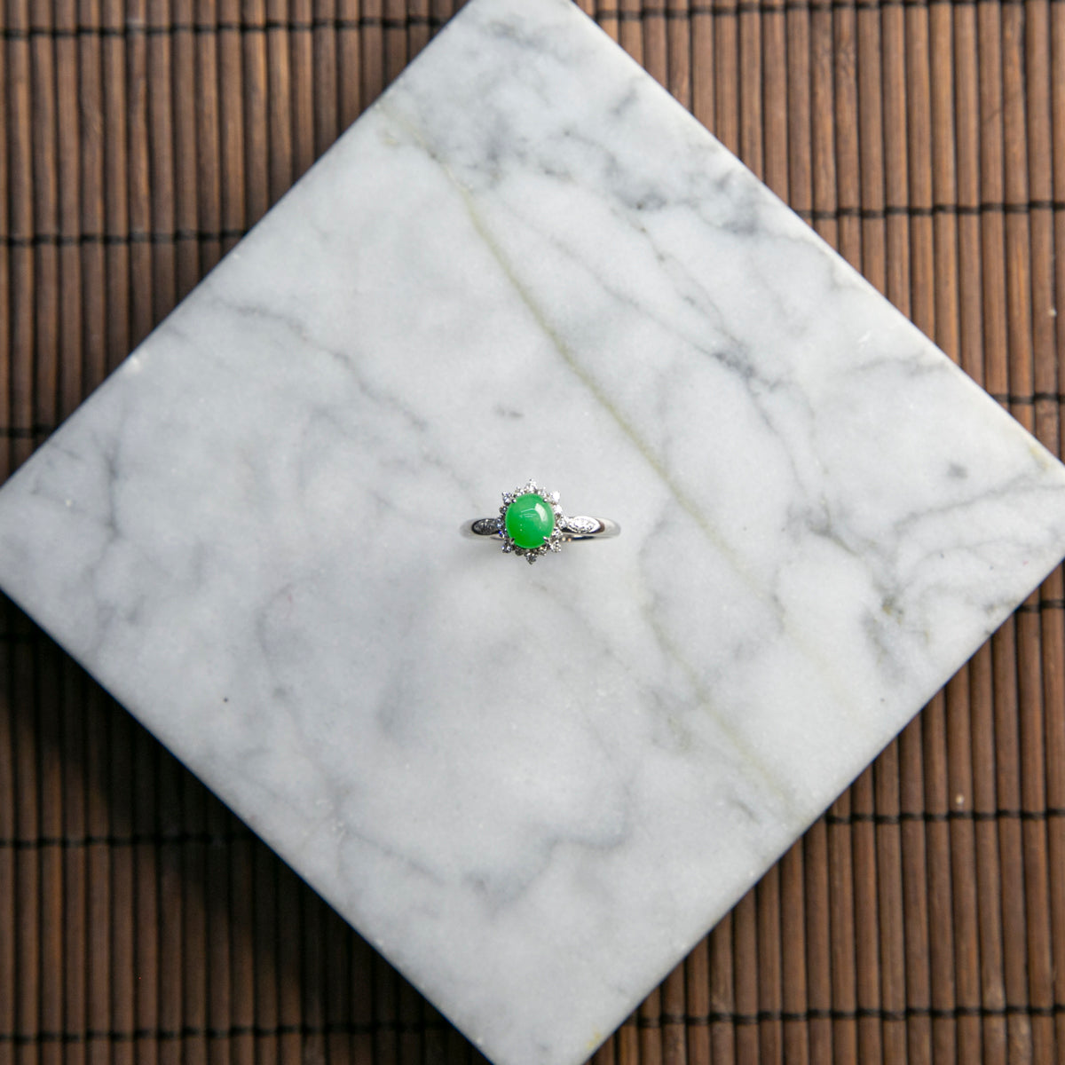 18K鉑金鑲鑽天然緬甸翡翠陽綠蛋面戒指