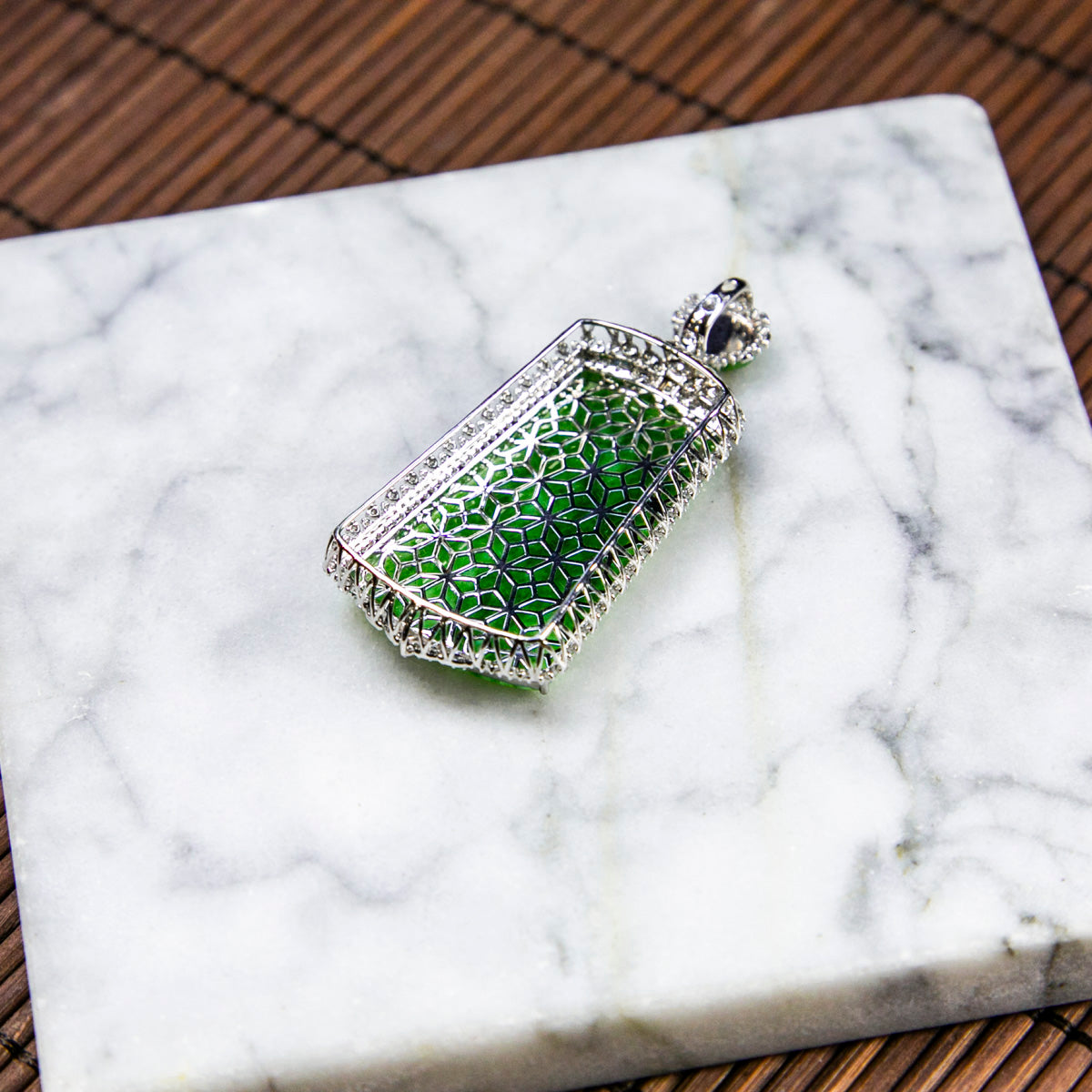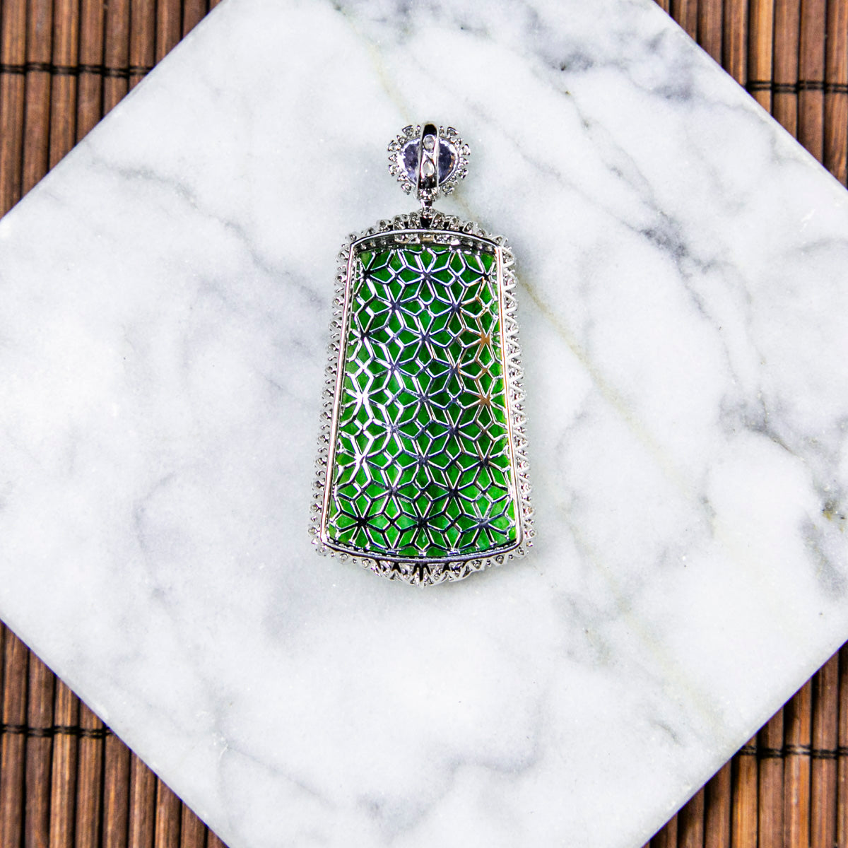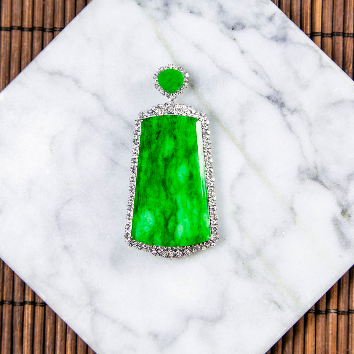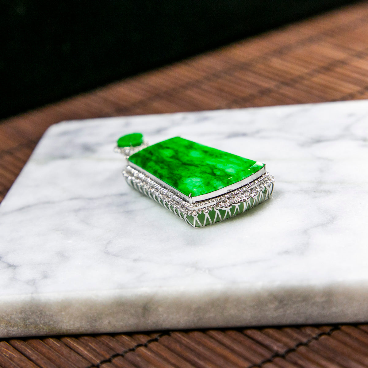 18K白金鑲鑽天然緬甸翡翠飄辣綠無事牌吊墜