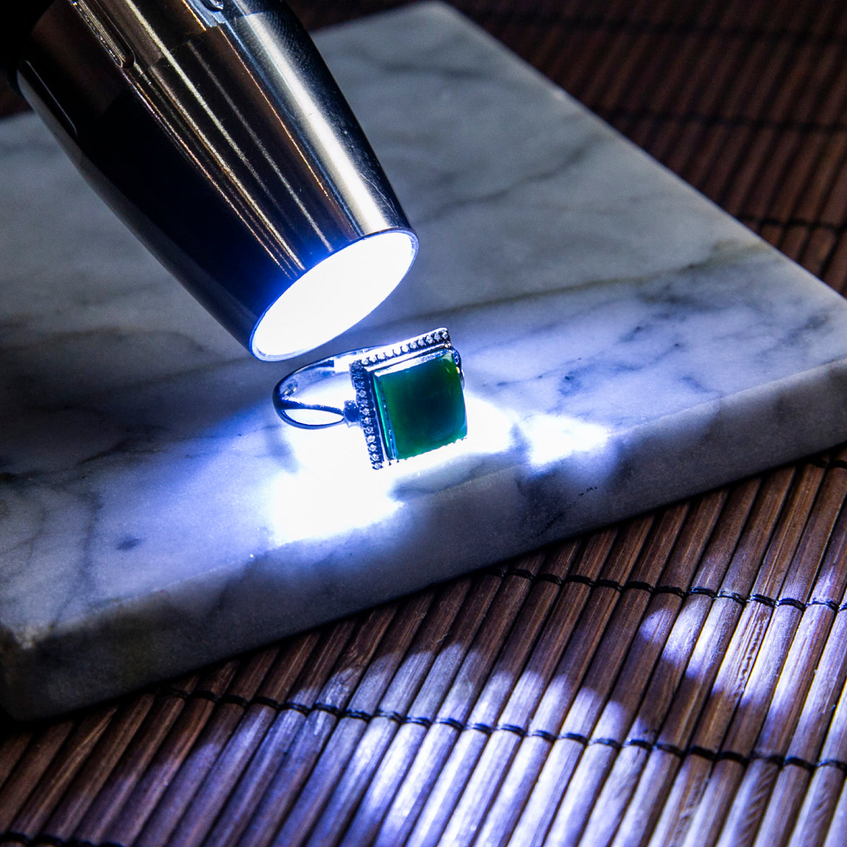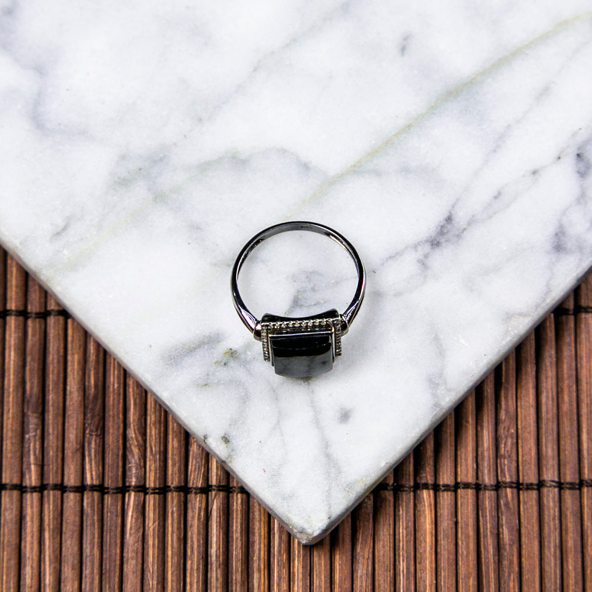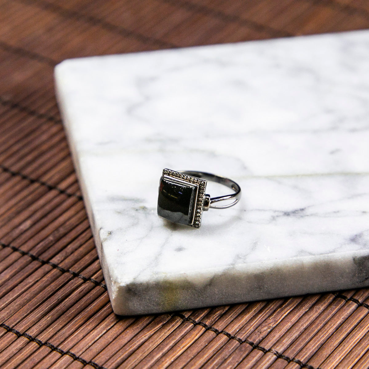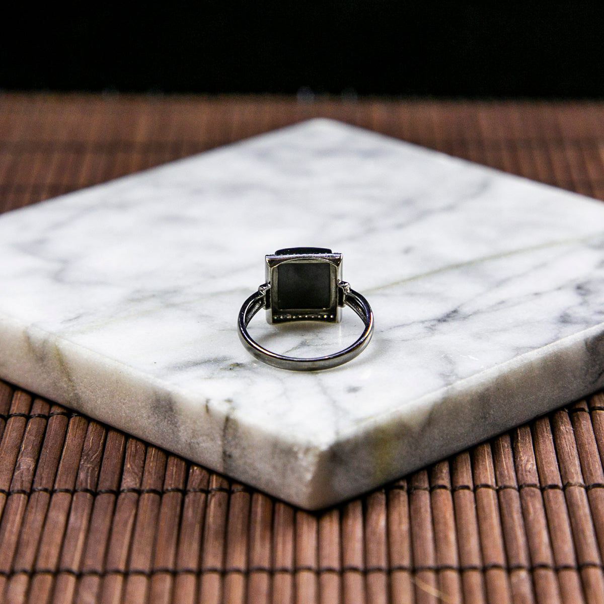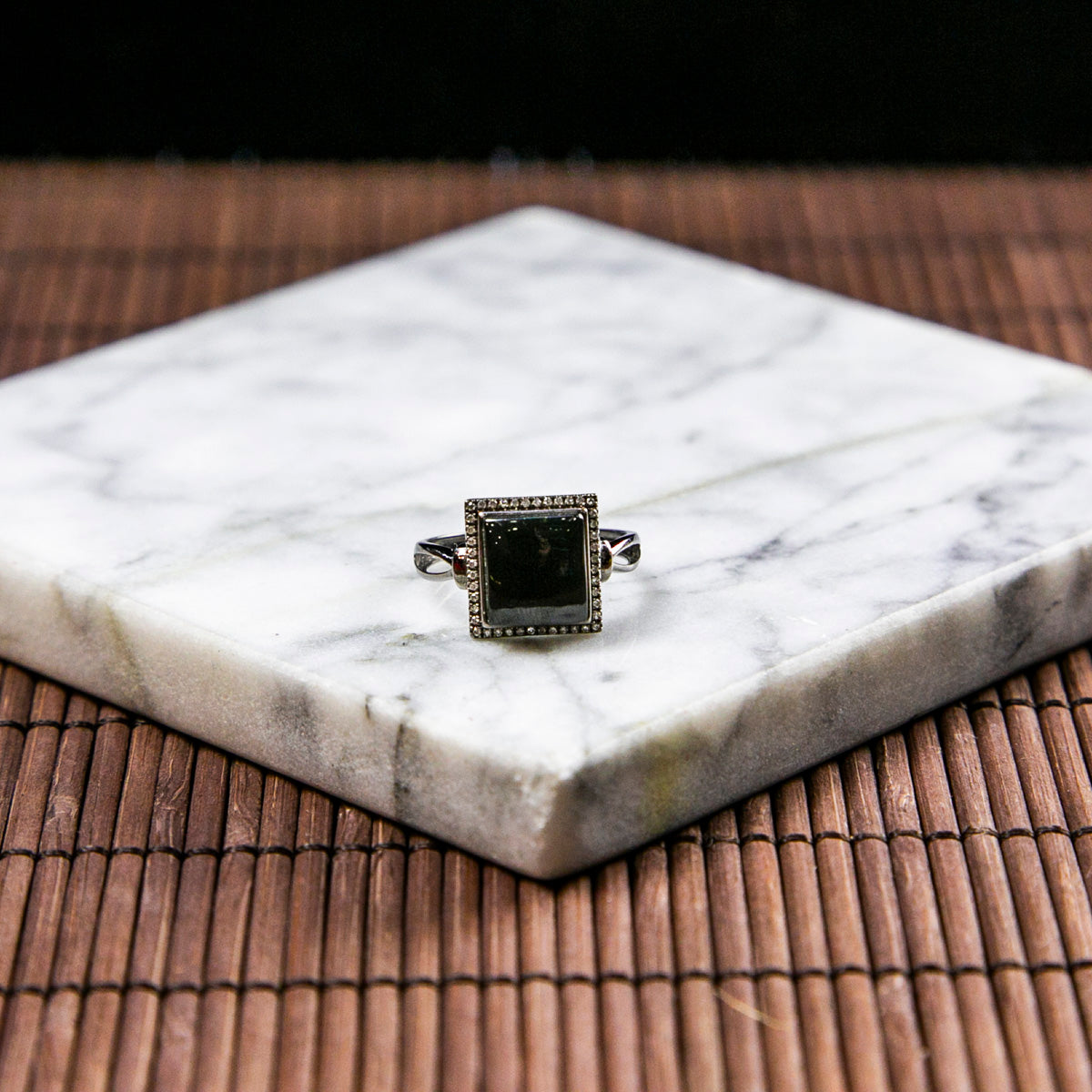 18K白金鑲鑽天然緬甸翡翠墨翠方形戒指