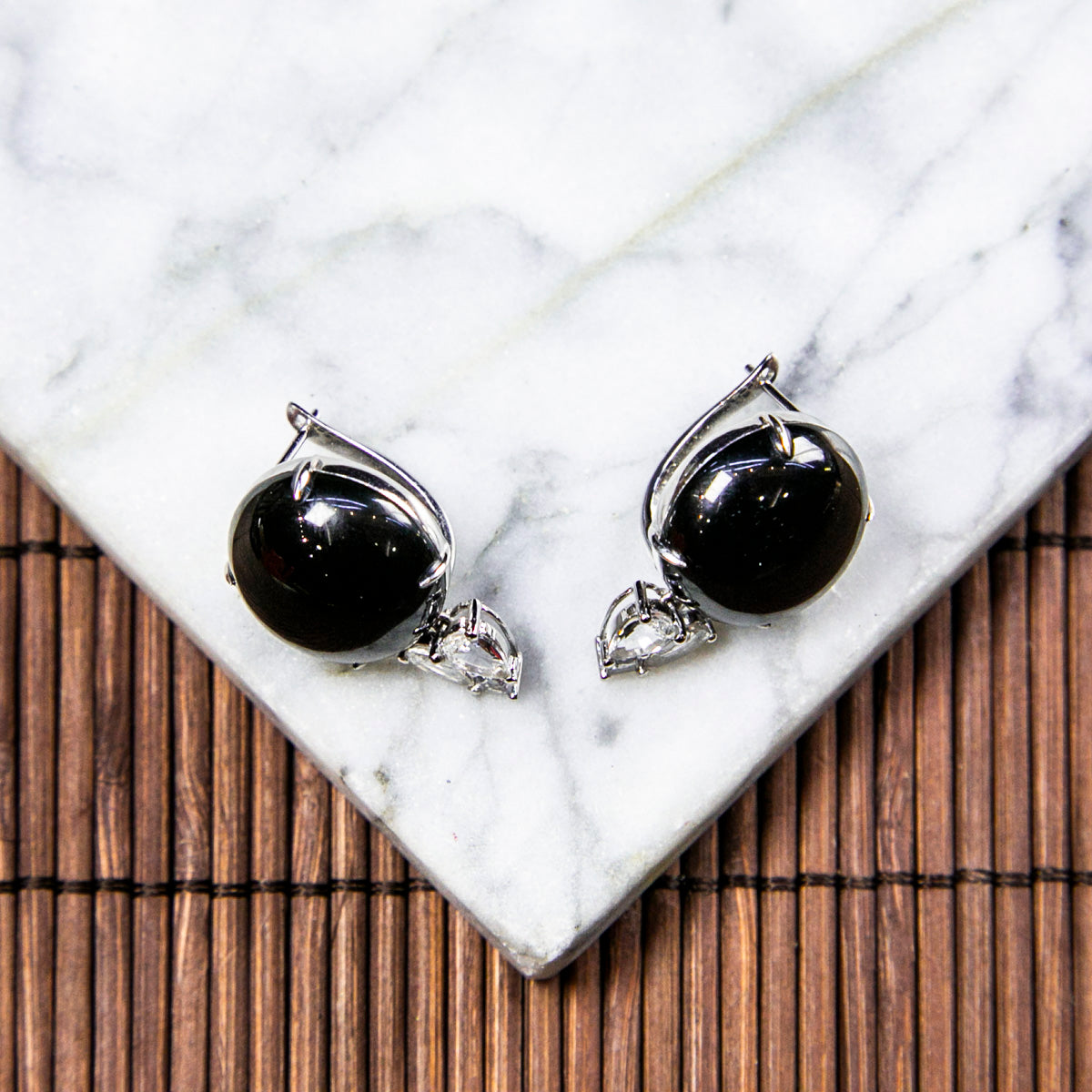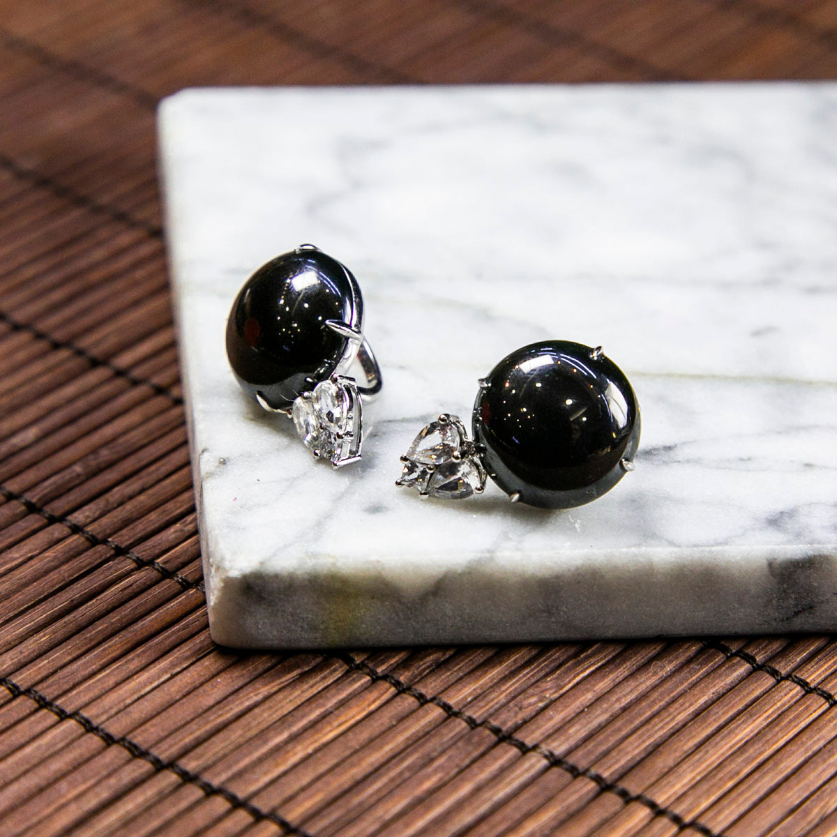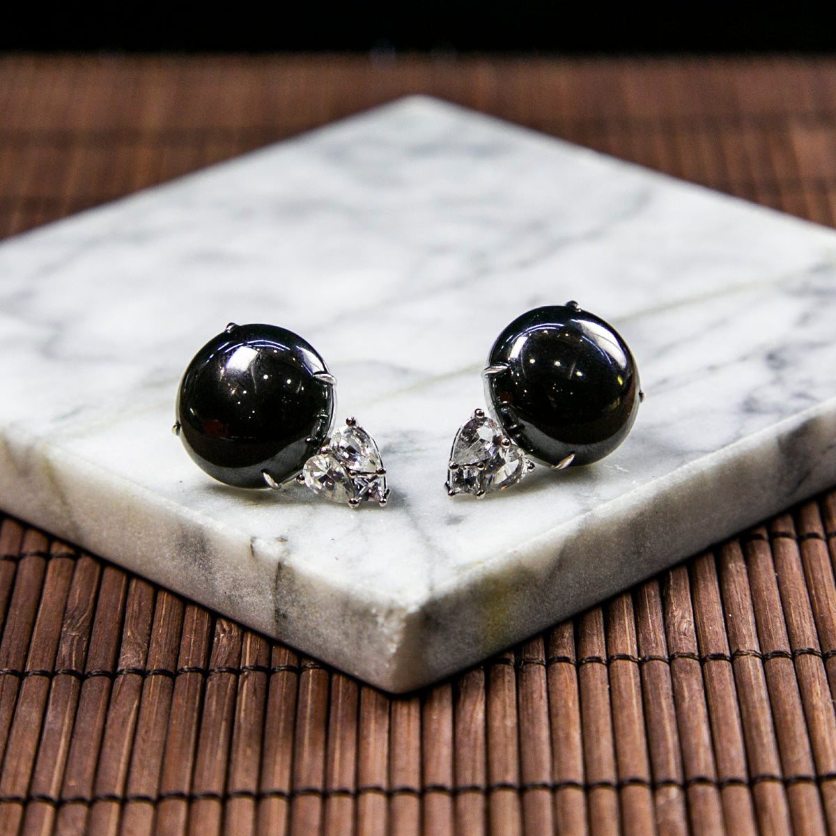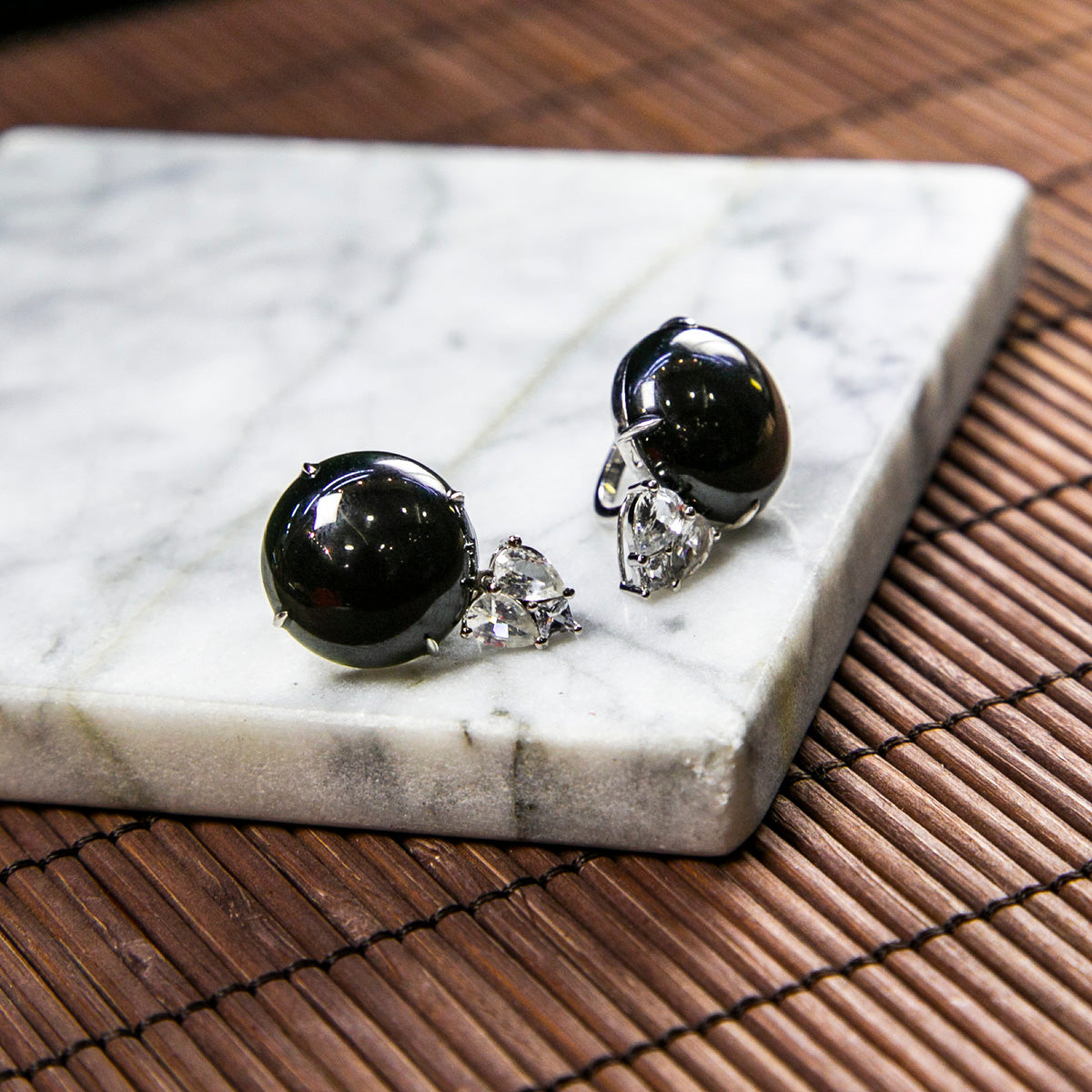 18K白金鑲鑽天然緬甸翡翠墨翠蛋面耳環