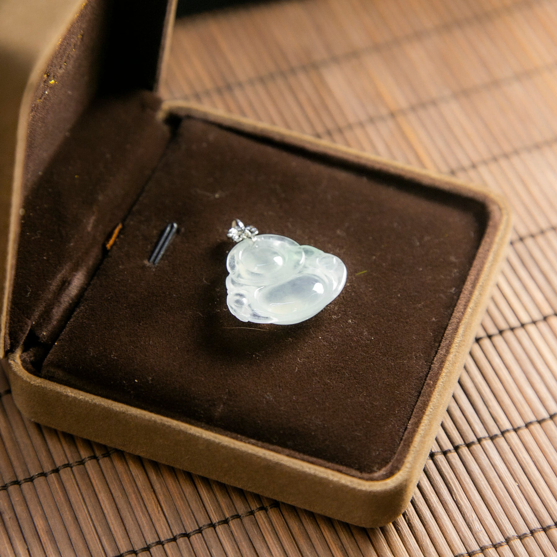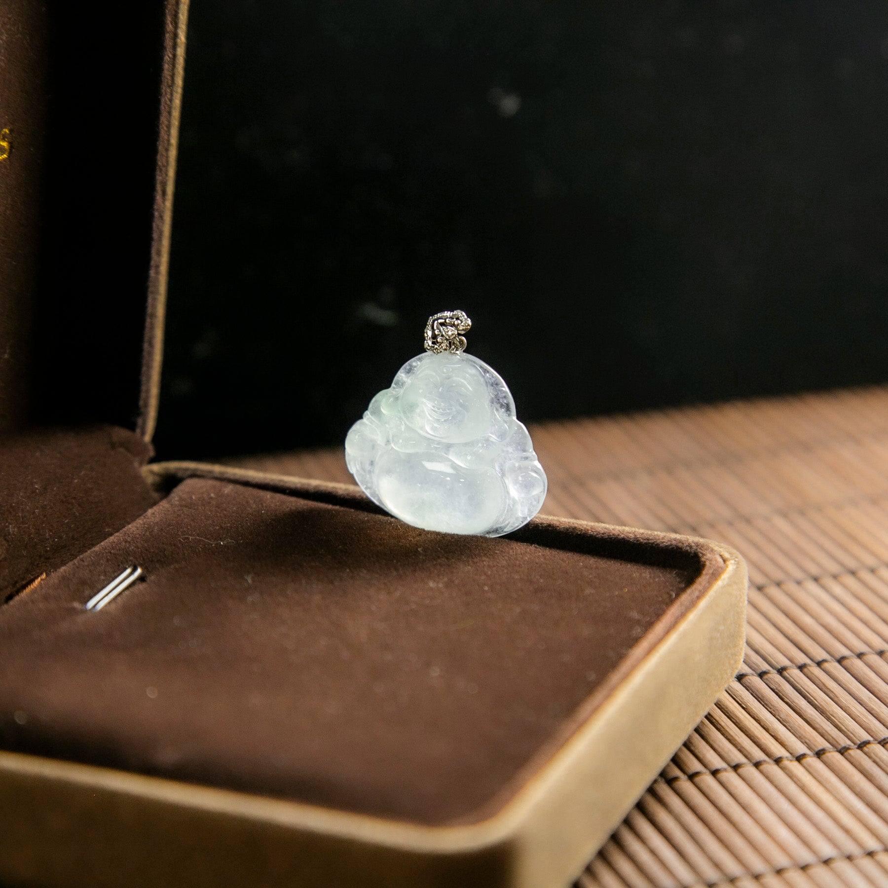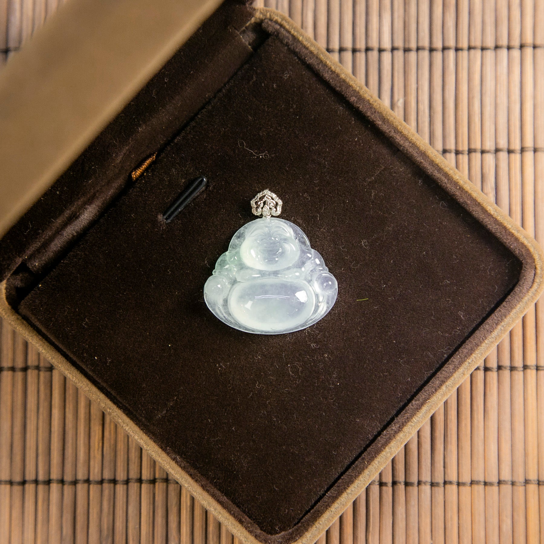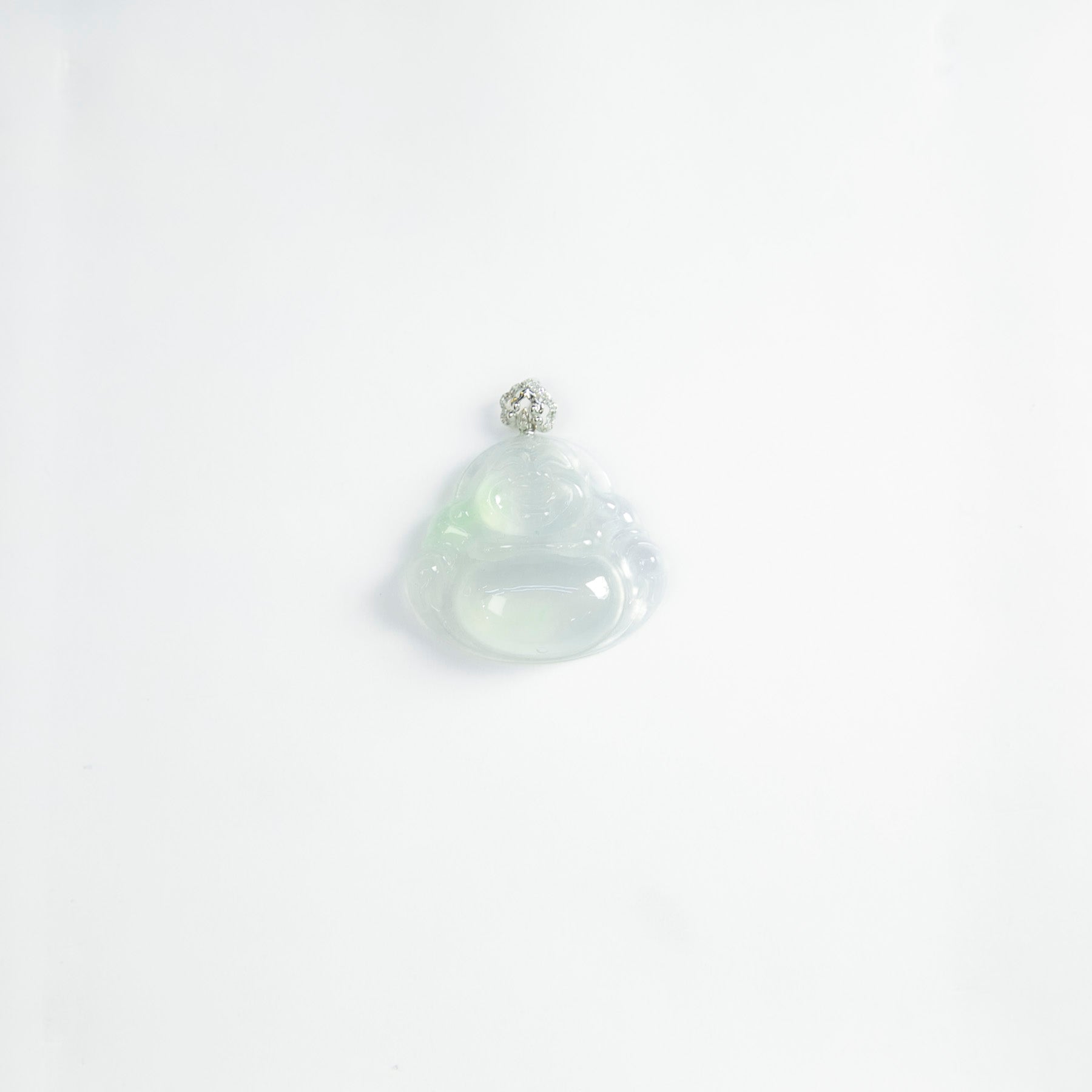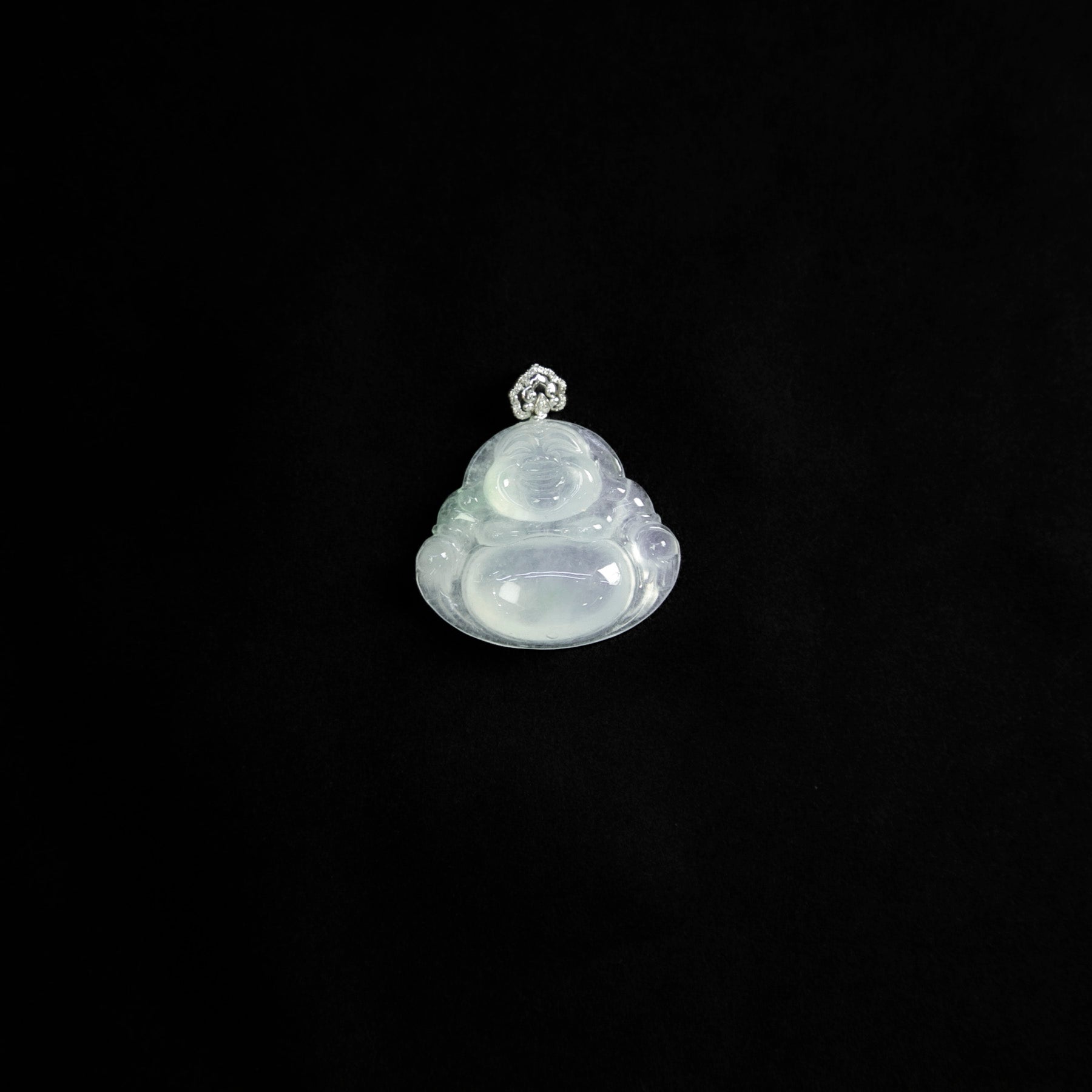 18K白金鑲鑽天然緬甸翡翠光感冰白笑佛吊墜