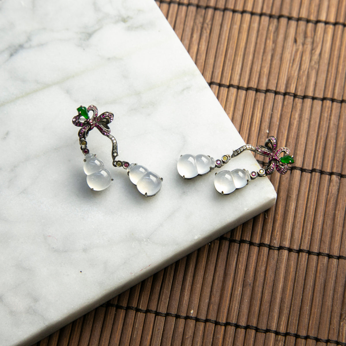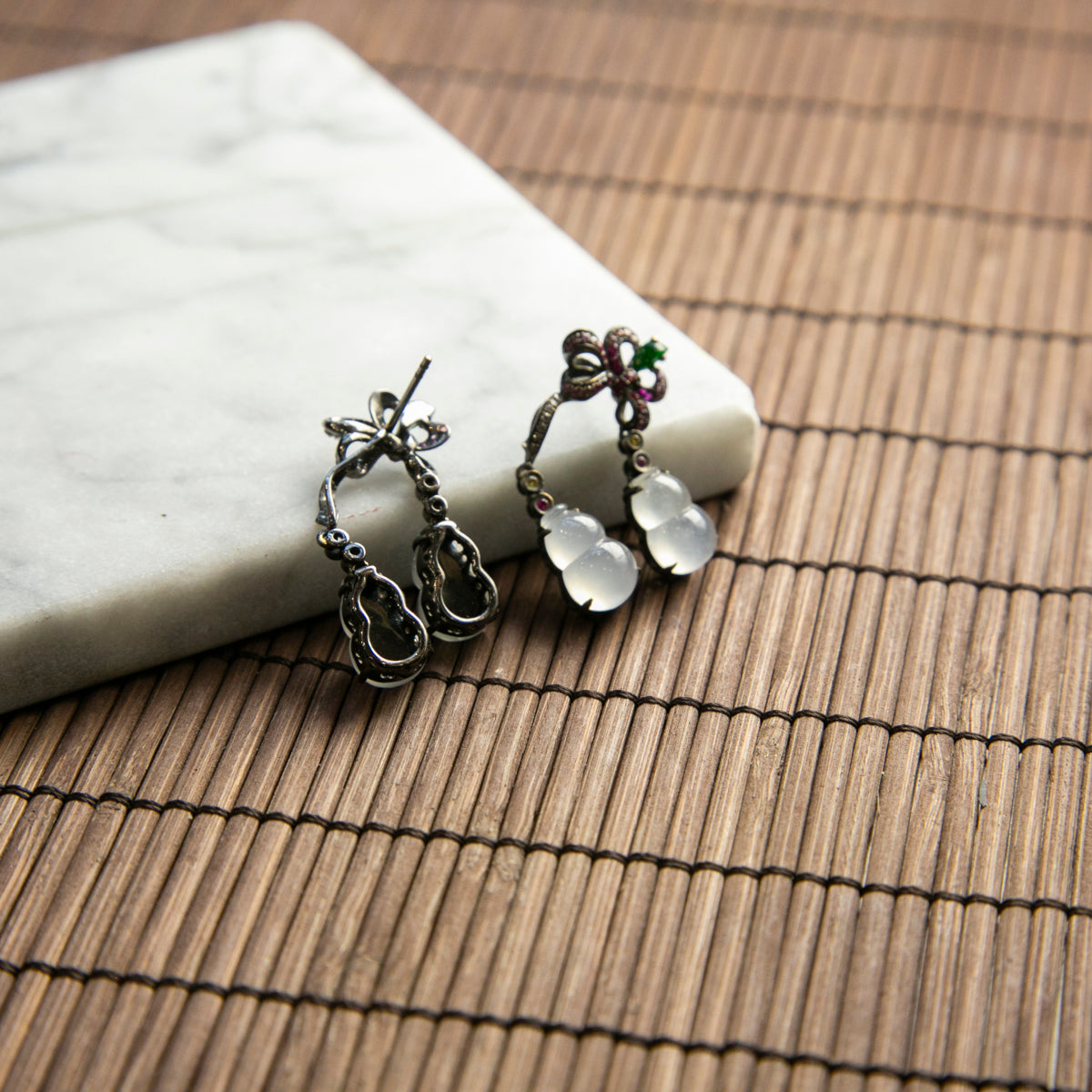 18K黑金鑲鑽天然緬甸玻璃種冰白翡翠葫蘆耳針