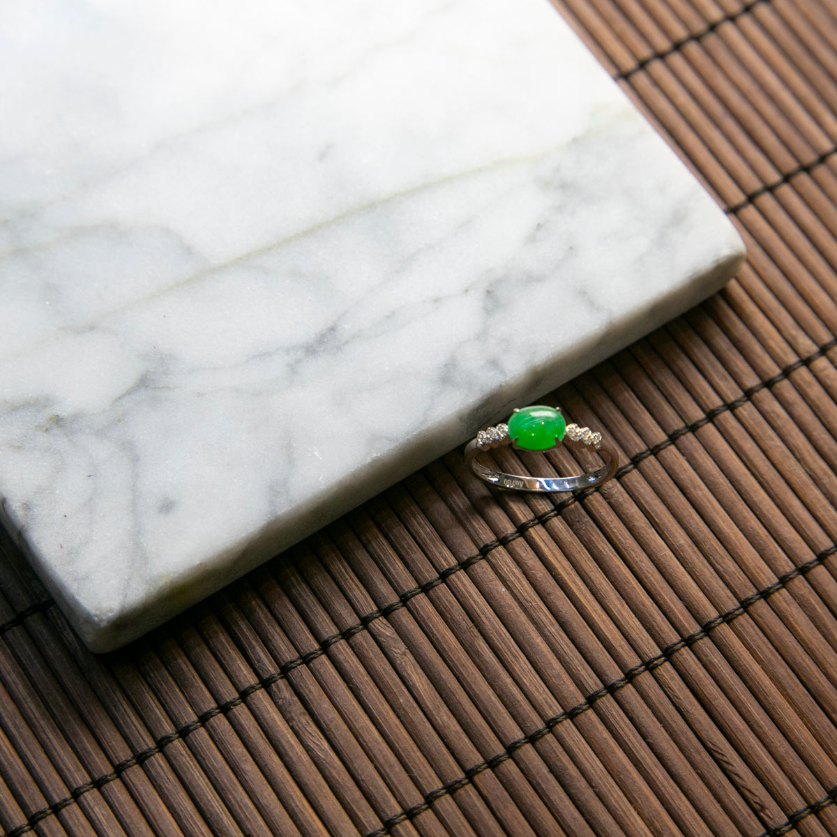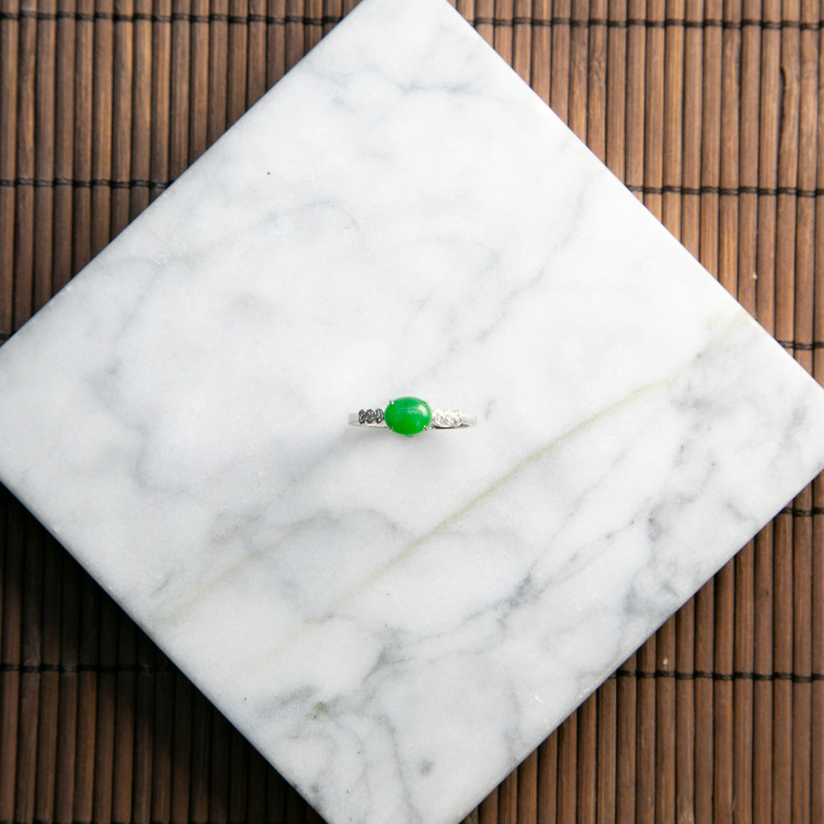 18K鉑金鑲鑽天然緬甸翡翠陽綠蛋面戒指