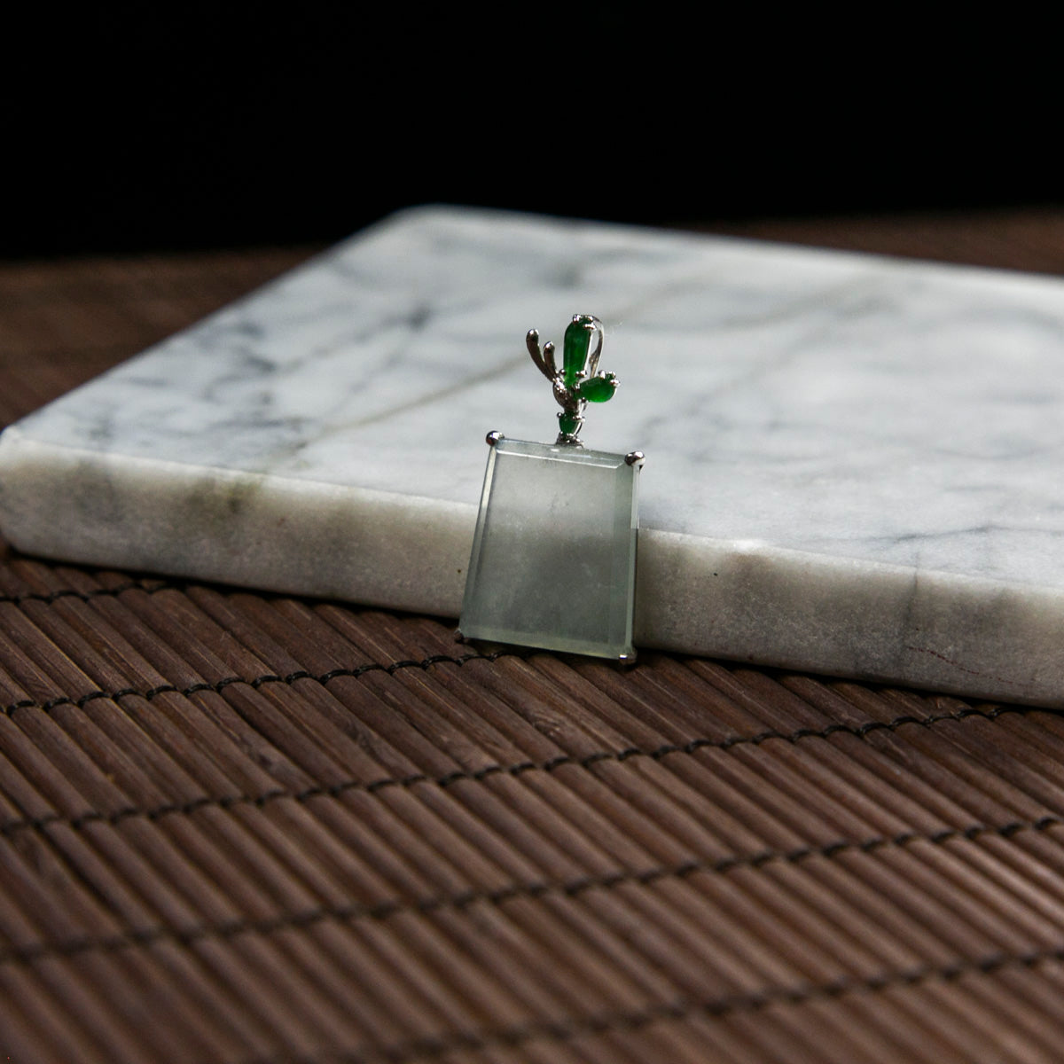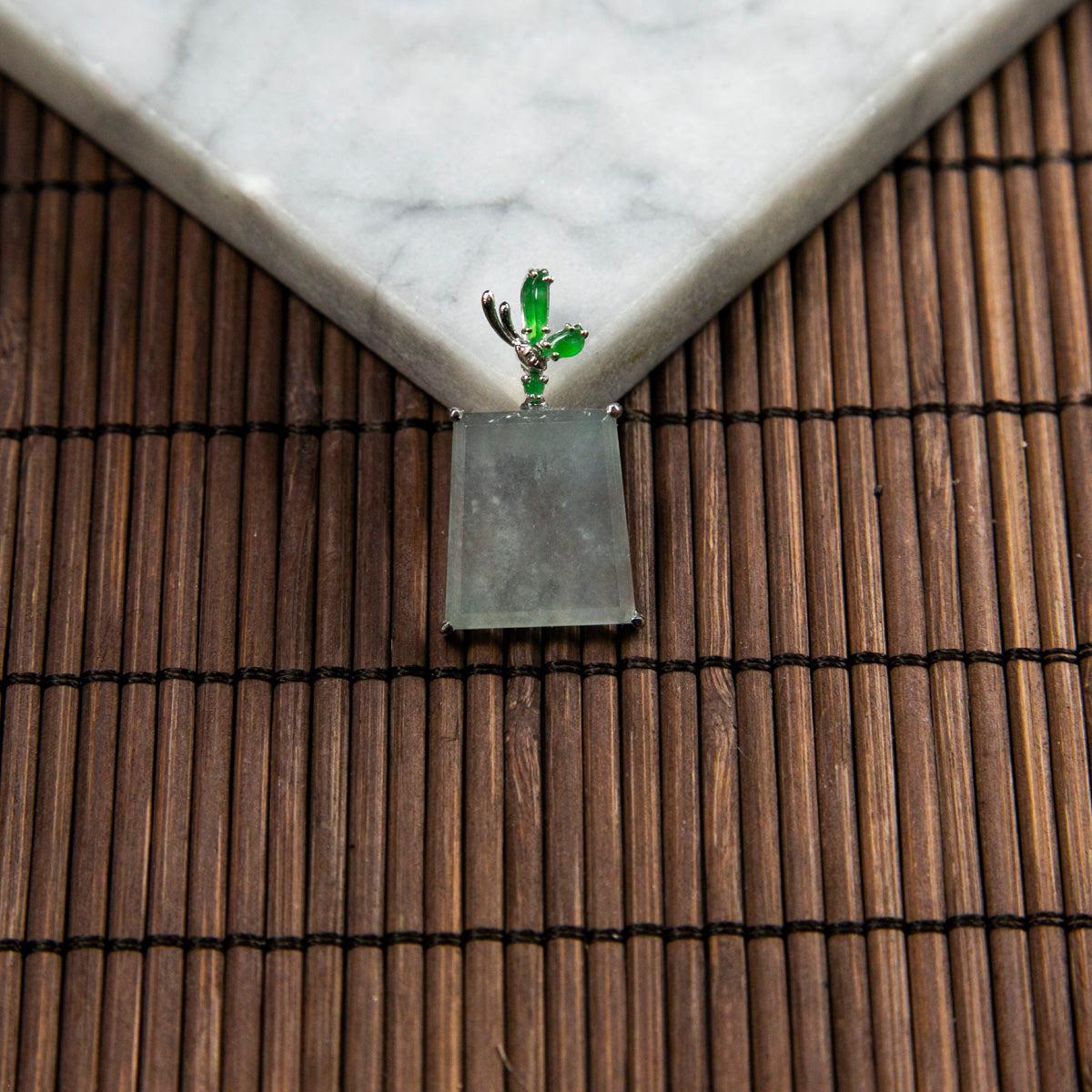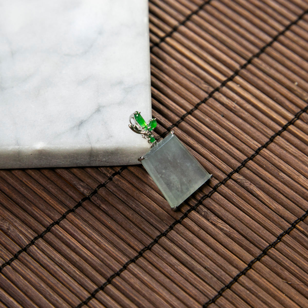 18K白金天然緬甸翡翠冰白無事牌吊墜配陽綠碎石