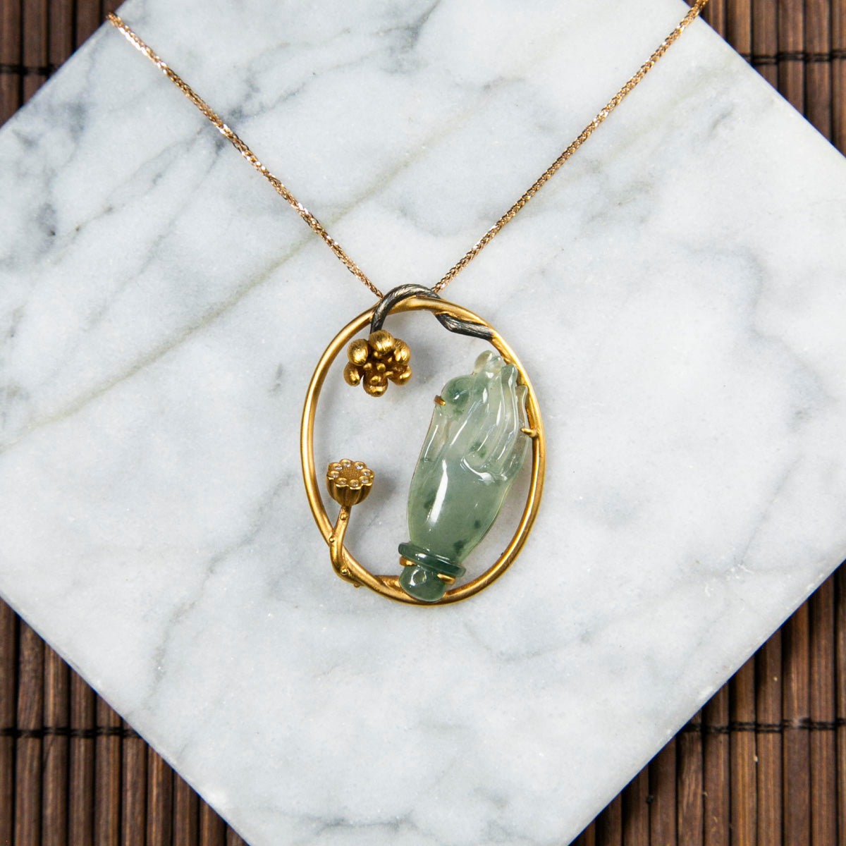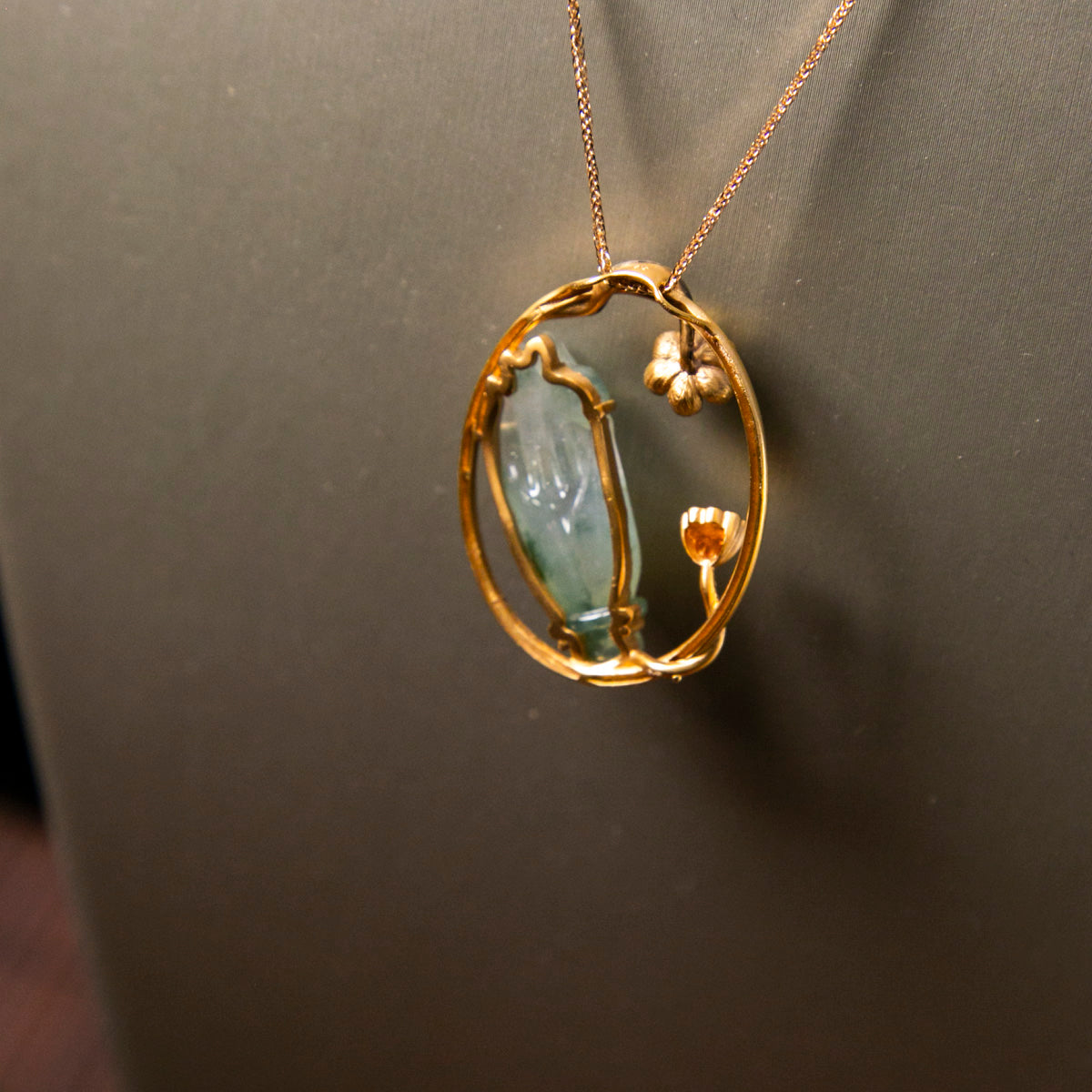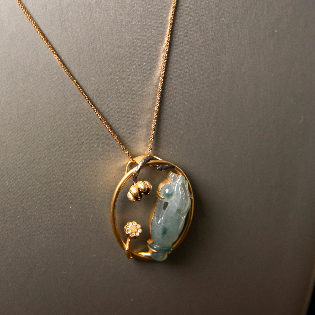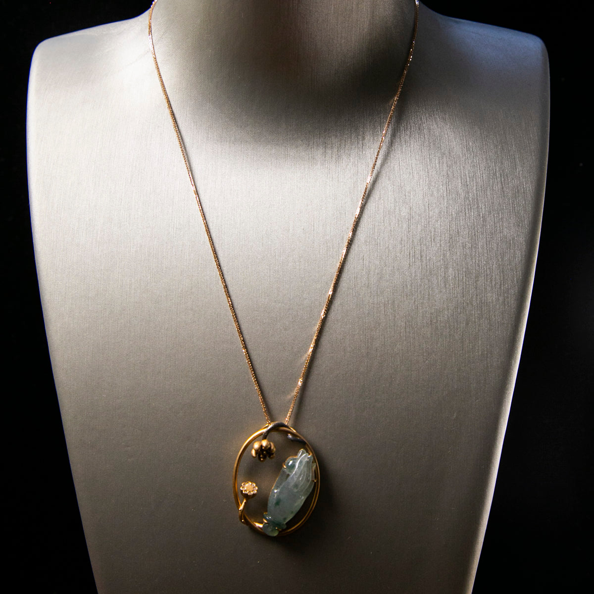 18K金鑲鑽天然緬甸翡翠白底飄花掌上明珠頸鏈