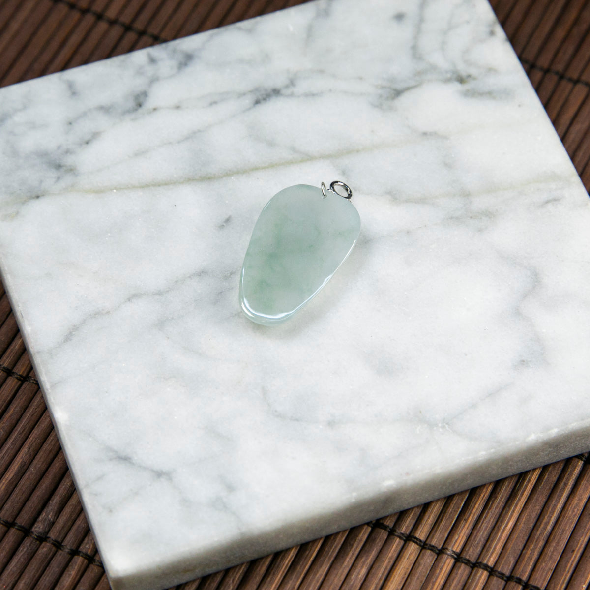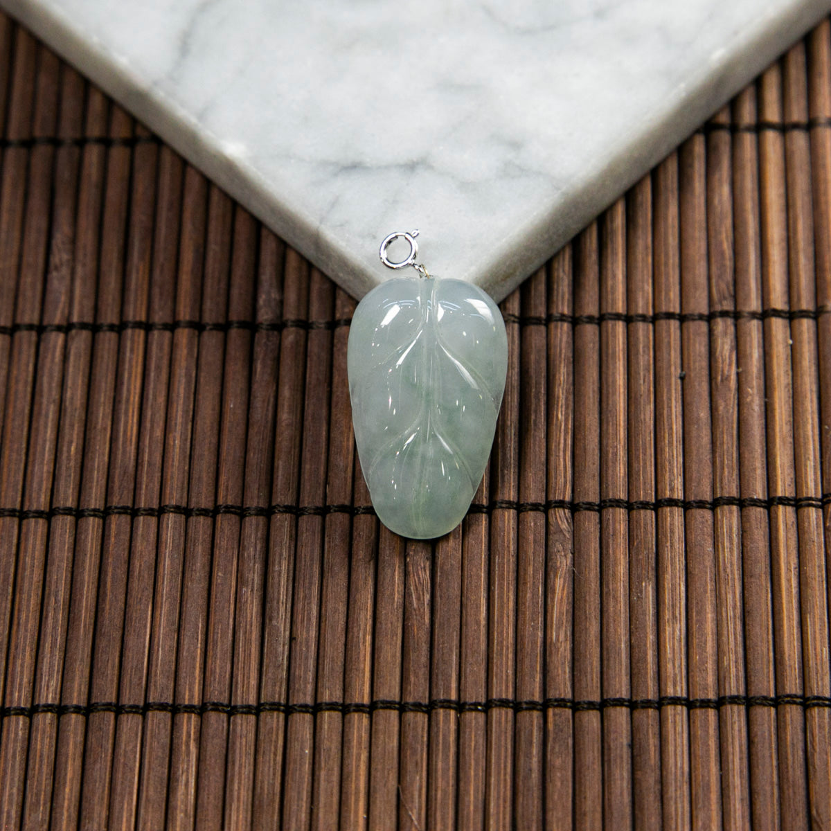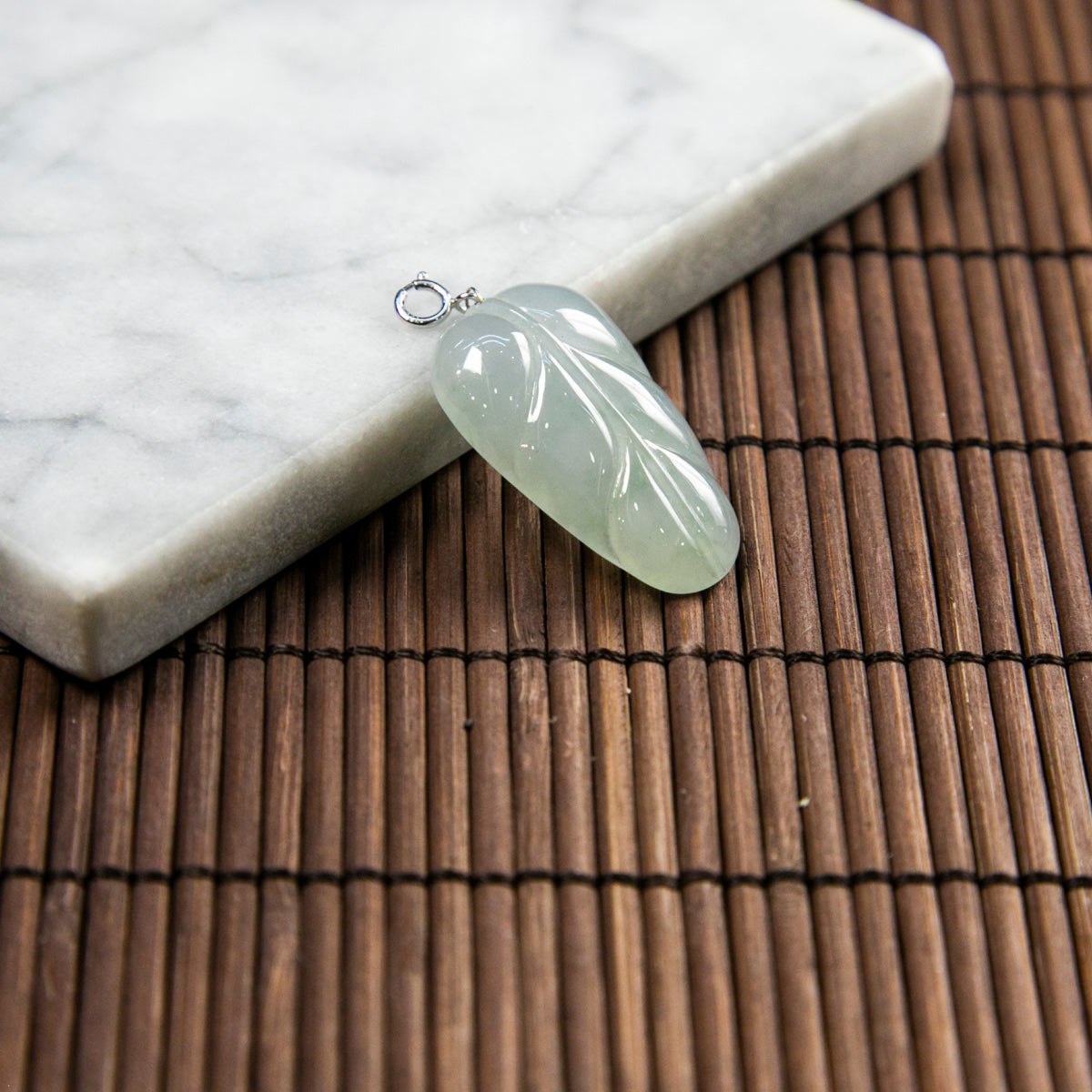 18K白金天然緬甸翡翠淡綠底飄綠葉片吊墜